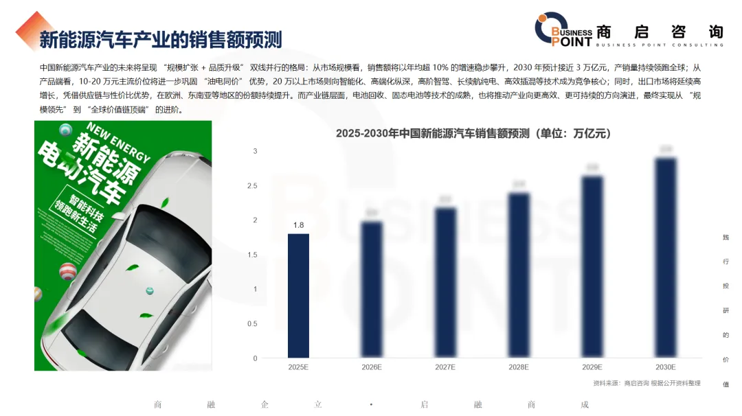 中国新能源汽车产业的未来将呈现 “规模扩张 + 品质升级” 双线并行的格局:从市场规模看,销售额将以年均超 10% 的增速稳步攀升,2030 年预计接近 3 万亿元,产销量持续领跑全球;从产品端看,10-20 万元主流价位将进一步巩固 “油电同价” 优势,20 万以上市场则向智能化、高端化纵深,高阶智驾、长续航纯电、高效插混等技术成为竞争核心;同时,出口市场将延续高增长,凭借供应链与性价比优势,在欧洲、东南亚等地区的份额持续提升。而产业链层面,电池回收、固态电池等技术的成熟,也将推动产业向更高效、更可持续的方向演进,最终实现从 “规模领先” 到 “全球价值链顶端” 的进阶。