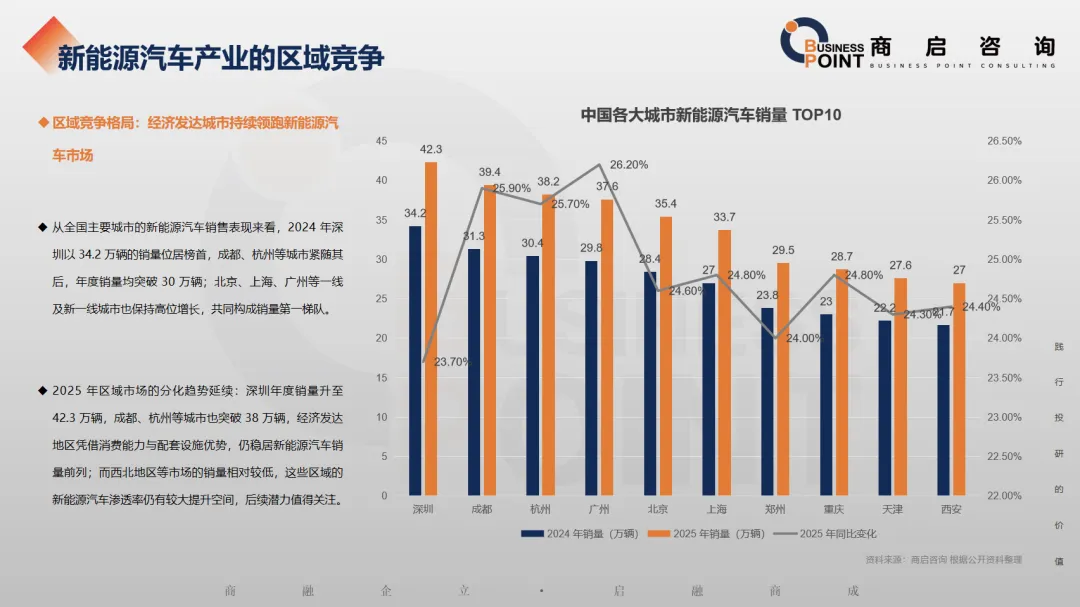 2025 年区域市场的分化趋势延续:深圳年度销量升至 42.3 万辆,成都、杭州等城市也突破 38 万辆,经济发达地区凭借消费能力与配套设施优势,仍稳居新能源汽车销量前列;而西北地区等市场的销量相对较低,这些区域的新能源汽车渗透率仍有较大提升空间,后续潜力值得关注。
