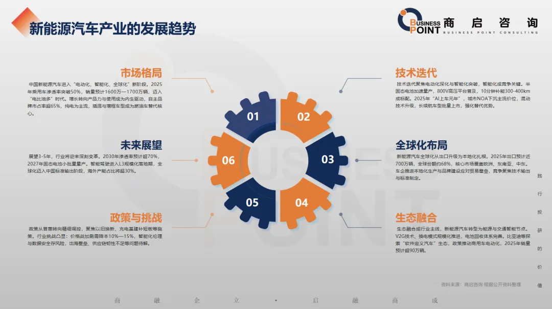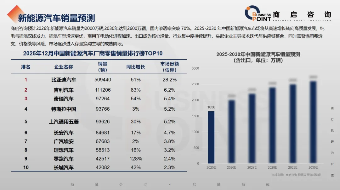 商启咨询预计2026年新能源汽车销量为2000万辆,2030年达到2600万辆,国内渗透率突破 70%。2025-2030 年中国新能源汽车市场将从高速增长转向高质量发展,纯电与插混双线发力,插混车型增速更优,商用车电动化进程加速。出口成为核心增量,行业集中度持续提升,头部企业主导技术迭代与供应链整合,同时需警惕消费透支、价格战等风险,市场逐步进入存量换购主导的成熟阶段。