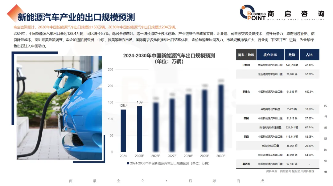 商启咨询预计,2026年中国新能源汽车出口规模达150万辆,2030年中国新能源汽车出口规模达204万辆。