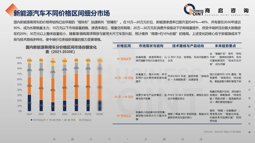 国内新能源乘用车的价格带结构已由早期的“哑铃形”加速转向“纺锤形”。在10万—20万元价位,新能源渗透率已提升至约45%—48%,并有望在2030年接近50%,成为长期销量主力;10万元以下市场容量趋稳、渗透率高位,增量空间有限;20万—30万元在消费升级驱动下仍有销量提升,但受中端挤压份额大致稳定在约20%;30万元以上整体容量较小,随着增/换购需求释放与家用大尺寸车型兴起,预计维持“微增+约10%份额”的格局。上述变化的核心在于新能源成本下探与技术路线多样化,使中端价位承接新增量的能力显著增强。