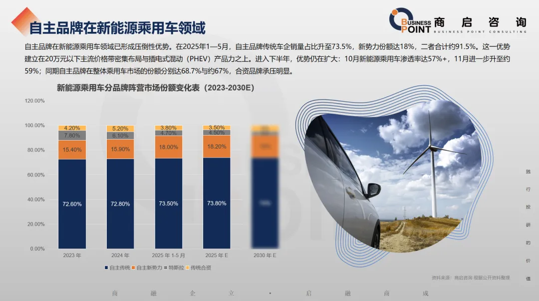 自主品牌在新能源乘用车领域已形成压倒性优势。在2025年1—5月,自主品牌传统车企销量占比升至73.5%,新势力份额达18%,二者合计约91.5%。这一优势建立在20万元以下主流价格带密集布局与插电式混动(PHEV)产品力之上。进入下半年,优势仍在扩大:10月新能源乘用车渗透率达57%+,11月进一步升至约59%;同期自主品牌在整体乘用车市场的份额分别达68.7%与约67%,合资品牌承压明显。