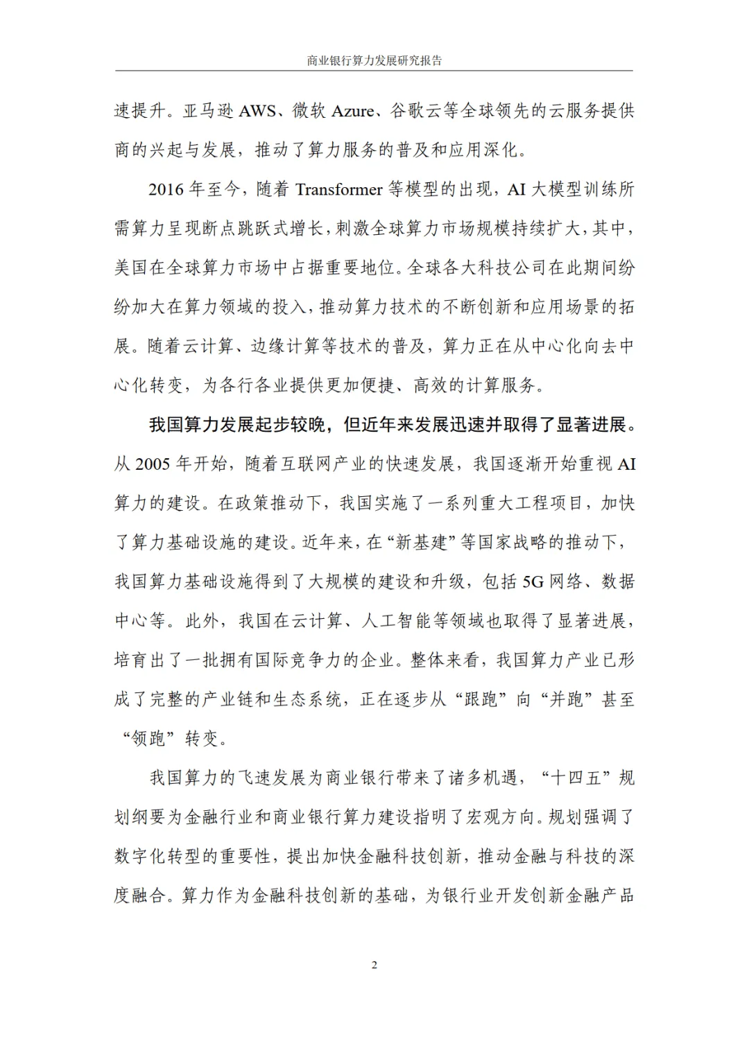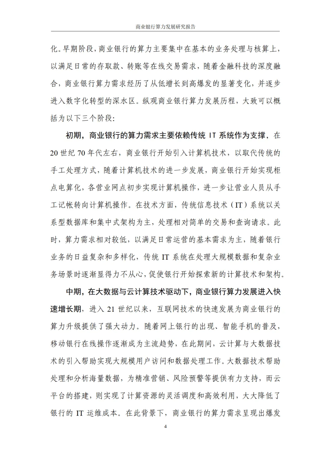 报告显示,商业银行算力发展历经传统 IT 基础设施、信息化初期、云计算创新、智能化转型四大阶段,当前已深度融入核心业务、风险管理、客户服务等关键环节。国家 “东数西算” 等政策为行业提供了明确方向,而金融大模型等技术应用则推动算力需求从单一计算向智能决策升级。