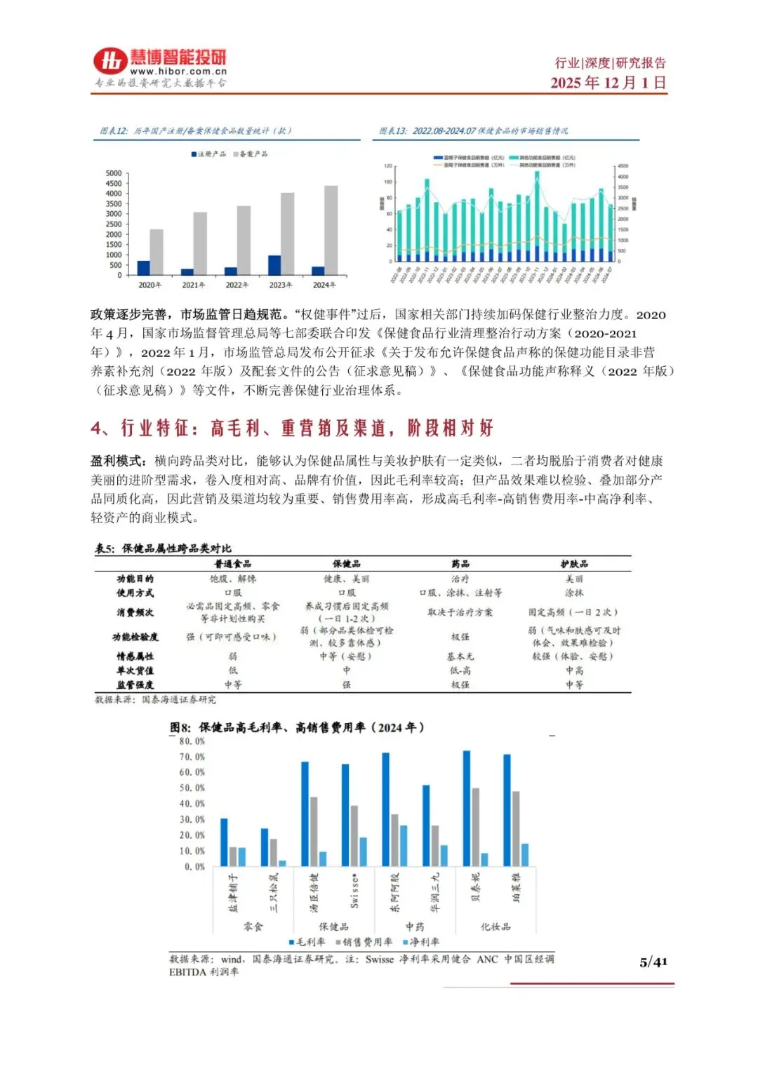报告系统梳理中国保健品行业“政策-需求-渠道-供给”全链条:2024 年市场规模 4150 亿元,6.6% 复合增速,线上占比 44% 已超药店;人均消费 26 美元仅为美国 1/7,65 岁渗透率 23% 对比美国 73%,成长空间 2-3 倍。政策端注册备案双轨制放宽准入,又借“权健后”严监管淘汰尾部;需求端银发经济(2035 年 60+人口>30%)与 Z 世代精准养生并行,宠物保健 2024 抖音 GMV 增速 225%。产业链高毛利(45%)、高销售费率、格局分散 CR5<30%,代工率 65%+。未来个性化定制、跨界生态、中国标准出海为三大方向。