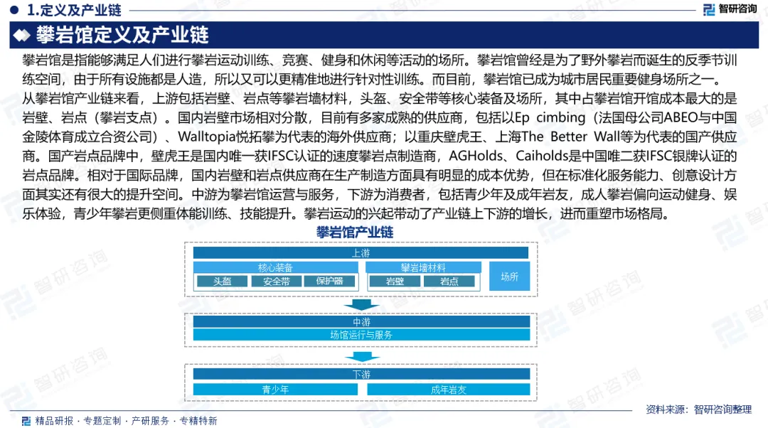 产业链:从攀岩馆产业链来看,上游包括岩壁、岩点等攀岩墙材料,头盔、安全带等核心装备及场所,其中占攀岩馆开馆成本最大的是岩壁、岩点(攀岩支点)。中游为攀岩馆运营与服务,下游为消费者,包括青少年及成年岩友,成人攀岩偏向运动健身、娱乐体验,青少年攀岩更侧重体能训练、技能提升。