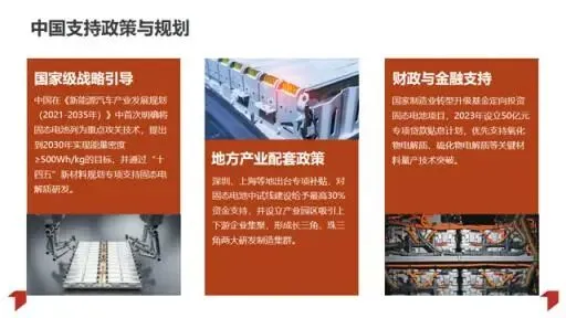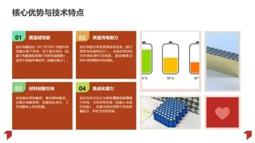 固态电池以固态电解质替代传统液态电解液,具备能量密度高、安全性强、宽温域适应等核心优势,可广泛应用于高端电动车、储能、航空航天等领域。与传统液态电池相比,其在极端环境稳定性和快充能力上表现突出,能量密度可达300Wh/kg以上,未来有望突破500Wh/kg。