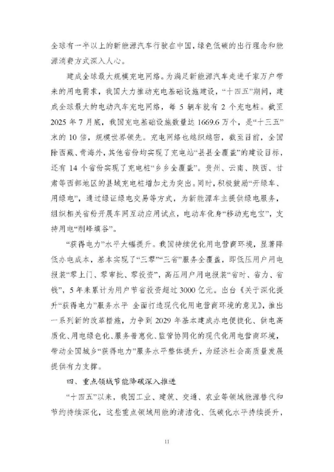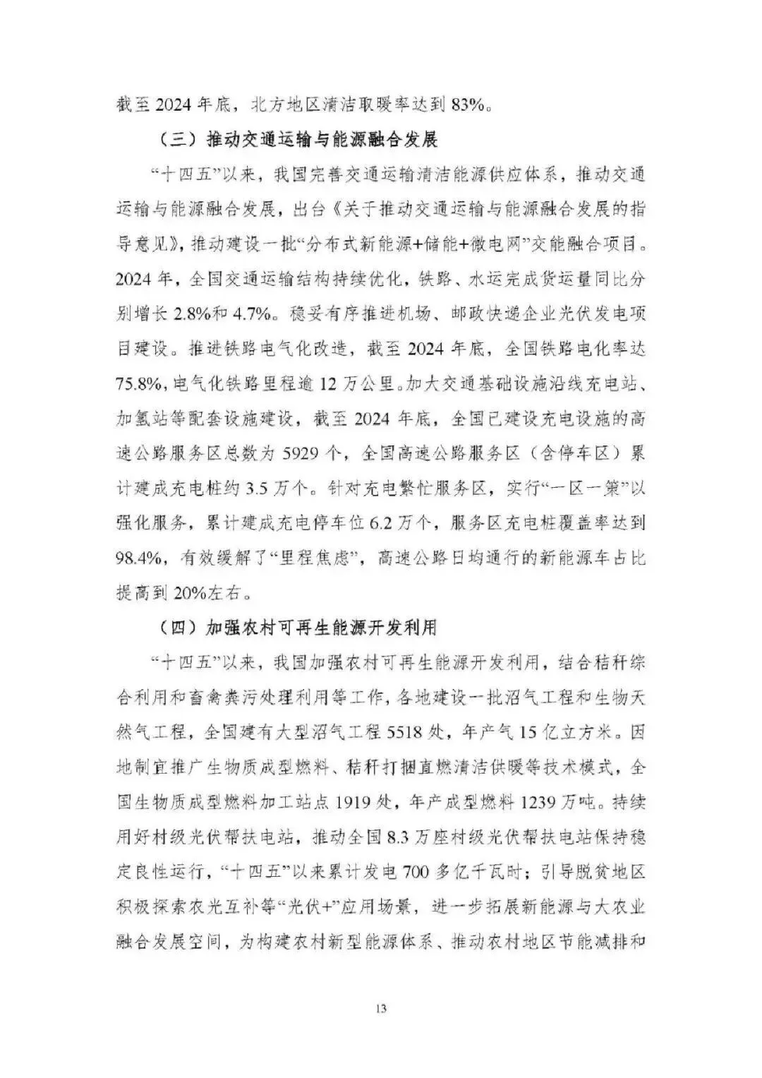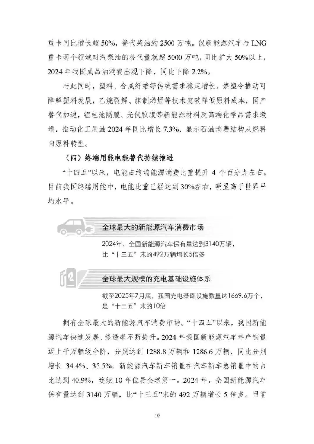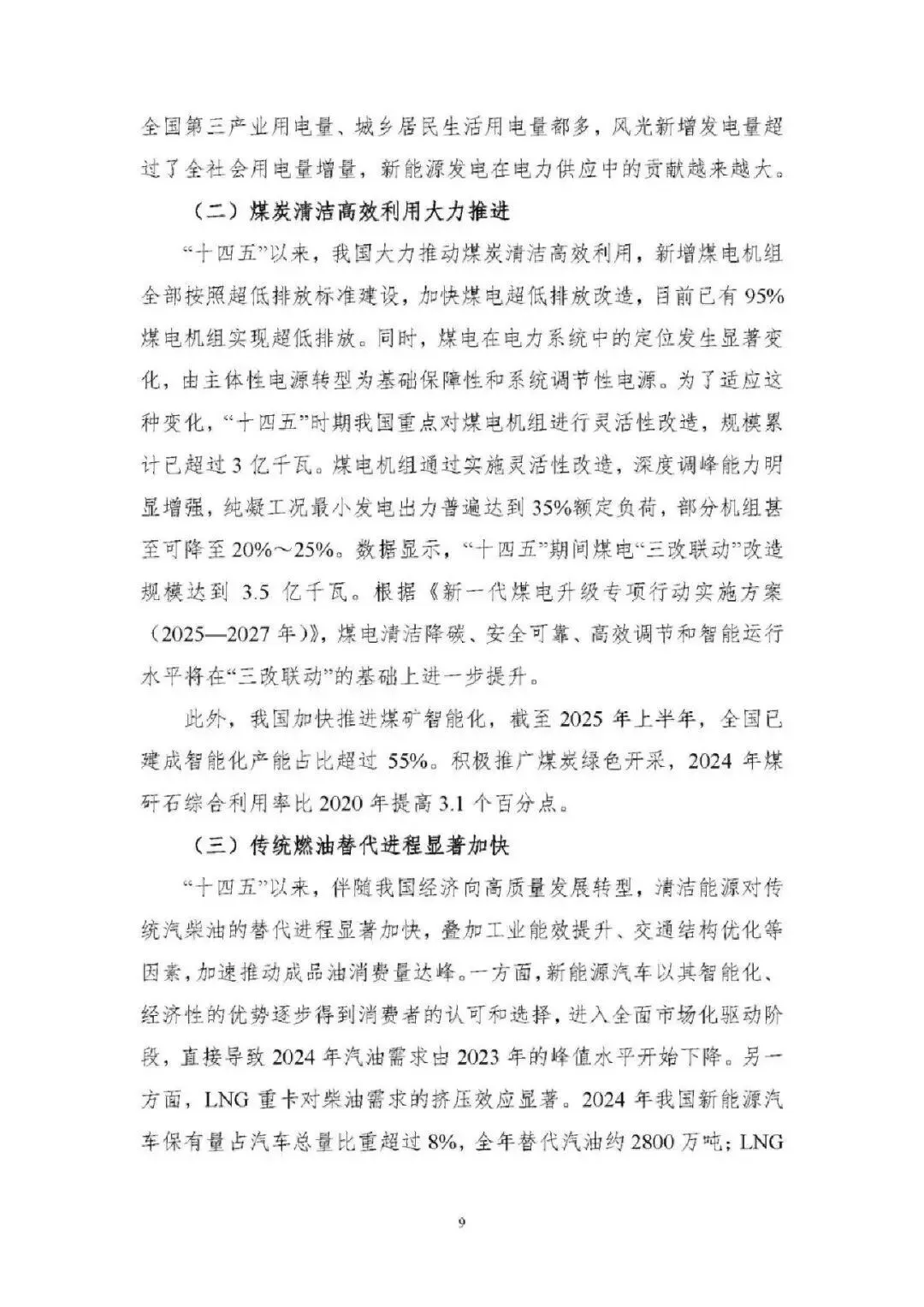 能源消费总量稳增且结构持续优化。2024 年能源消费总量达 59.6 亿吨标准煤,“新三样” 全产业链新增消费占增量 65%;电力消费增速连续高于 GDP 增速,2024 年全社会用电量 9.85 万亿千瓦时;非化石能源消费占比提升至 19.8%,煤炭消费占比降至 53.2%,电能占终端用能比重达 30%,绿色低碳转型成效显著。 能源供给保障能力全面增强。能源自给率保持 80% 以上,2024 年发电量超 10 万亿千瓦时;煤炭绿色智能开发提速,智能化产能占比超 55%;油气增储上产实现历史性突破,2024 年产量当量超 4 亿吨;非化石能源装机突破 21 亿千瓦,风光发电装机与发电量稳居全球第一,核电成为世界第一大国。 能源科技创新实现跨越式突破。清洁能源技术领跑全球,水电、光伏、风电全产业链技术领先,氢能、新型储能技术加快产业化;核电技术从 “跟跑” 到 “领跑”,第四代核电示范工程投运;电网与储能技术创新深化,换流变分接开关等核心装备国产化,压缩空气储能达世界领先水平;化石能源清洁利用技术持续升级,燃气轮机突破海外垄断。 能源体制改革进入快车道。构建 “X+1+X” 油气市场体系、全国统一电力市场体系,煤炭交易市场与碳市场不断完善;能源价格市场化改革推进,油气、电力、煤炭价格形成机制优化;现代能源治理体系加快构建,法律法规、监管效能、标准体系持续完善,为能源高质量发展提供制度保障。 能源国际合作构建立体多元新格局。“一带一路” 能源合作伙伴关系深化,成员国扩至 34 个;能源资源合作与运输通道持续巩固,中俄、中亚等油气合作成效显著;绿色能源合作覆盖全球,光伏组件、风电装备出口占全球 70% 以上;技术合作与贸易投资持续深化,绿色金融创新助力全球能源低碳转型。