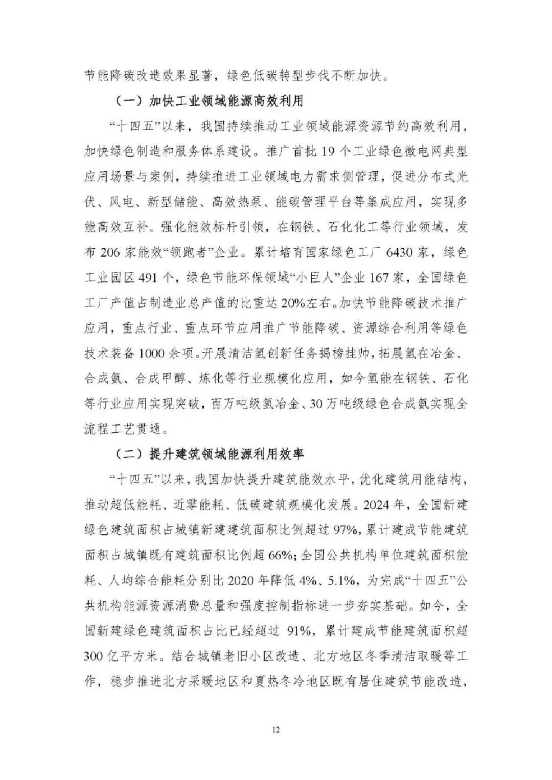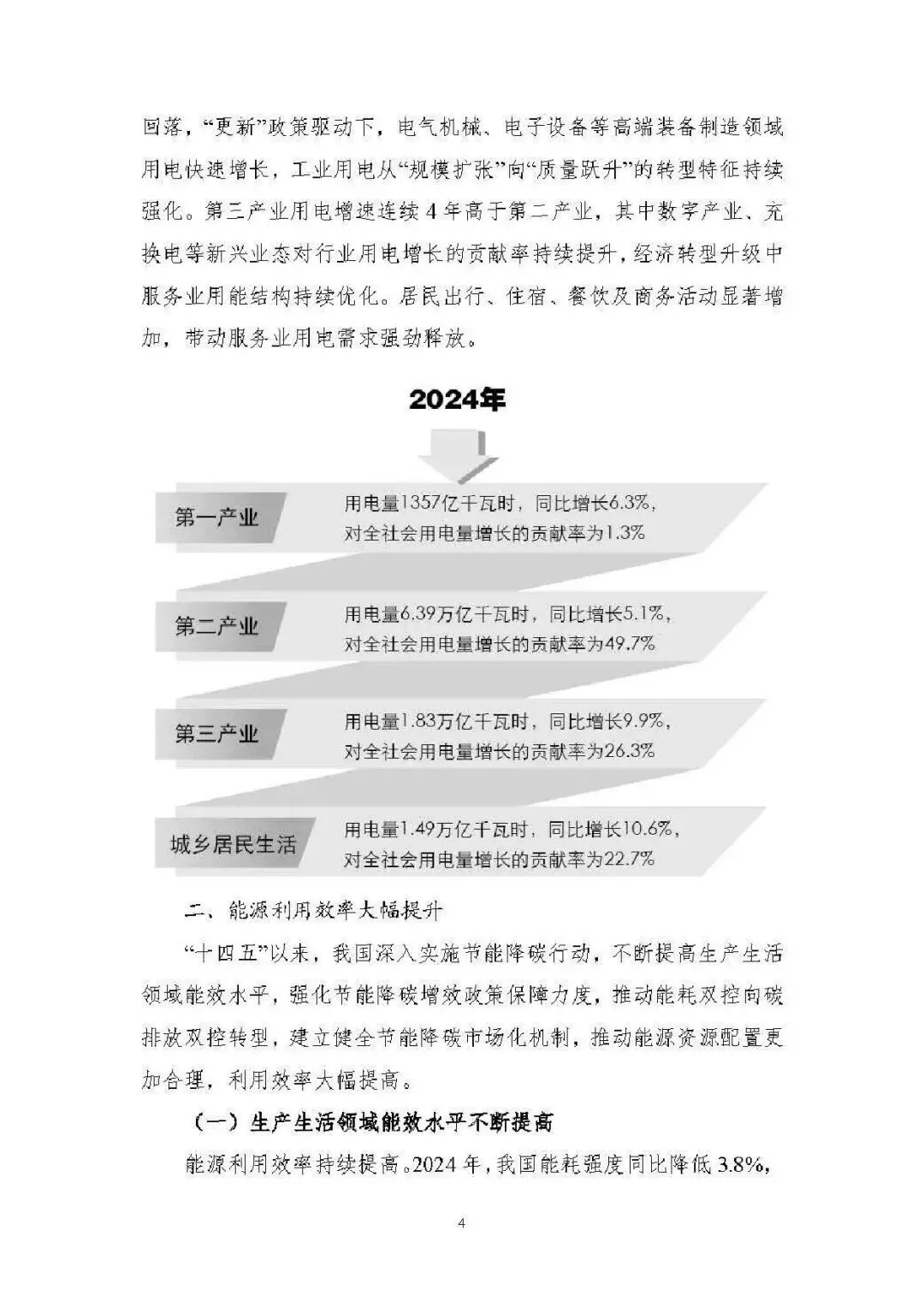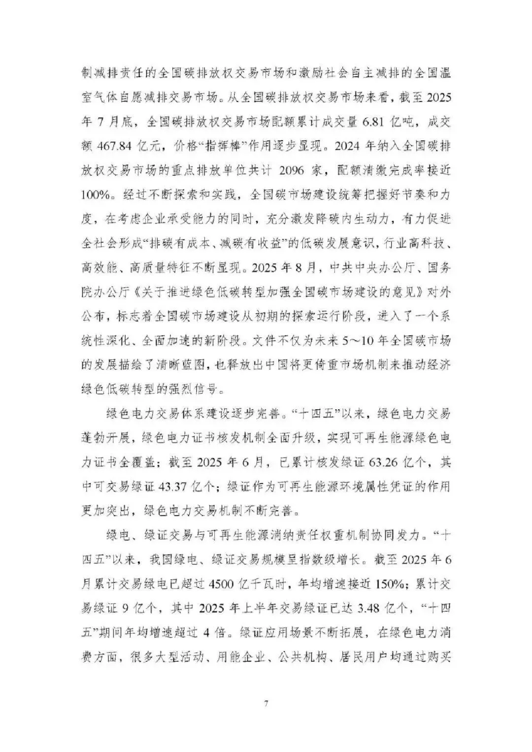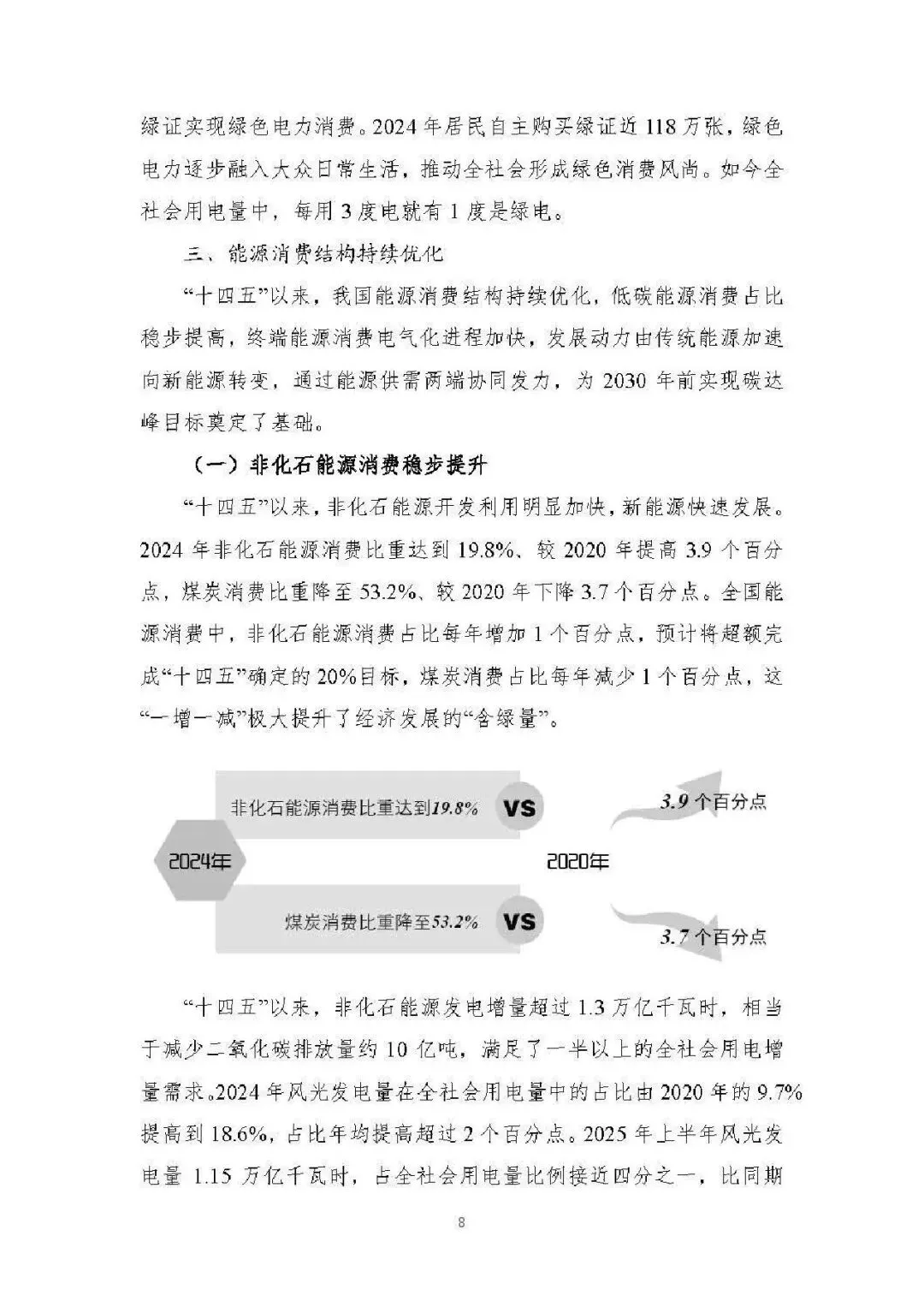 能源消费总量稳增且结构持续优化。2024 年能源消费总量达 59.6 亿吨标准煤,“新三样” 全产业链新增消费占增量 65%;电力消费增速连续高于 GDP 增速,2024 年全社会用电量 9.85 万亿千瓦时;非化石能源消费占比提升至 19.8%,煤炭消费占比降至 53.2%,电能占终端用能比重达 30%,绿色低碳转型成效显著。 能源供给保障能力全面增强。能源自给率保持 80% 以上,2024 年发电量超 10 万亿千瓦时;煤炭绿色智能开发提速,智能化产能占比超 55%;油气增储上产实现历史性突破,2024 年产量当量超 4 亿吨;非化石能源装机突破 21 亿千瓦,风光发电装机与发电量稳居全球第一,核电成为世界第一大国。 能源科技创新实现跨越式突破。清洁能源技术领跑全球,水电、光伏、风电全产业链技术领先,氢能、新型储能技术加快产业化;核电技术从 “跟跑” 到 “领跑”,第四代核电示范工程投运;电网与储能技术创新深化,换流变分接开关等核心装备国产化,压缩空气储能达世界领先水平;化石能源清洁利用技术持续升级,燃气轮机突破海外垄断。 能源体制改革进入快车道。构建 “X+1+X” 油气市场体系、全国统一电力市场体系,煤炭交易市场与碳市场不断完善;能源价格市场化改革推进,油气、电力、煤炭价格形成机制优化;现代能源治理体系加快构建,法律法规、监管效能、标准体系持续完善,为能源高质量发展提供制度保障。 能源国际合作构建立体多元新格局。“一带一路” 能源合作伙伴关系深化,成员国扩至 34 个;能源资源合作与运输通道持续巩固,中俄、中亚等油气合作成效显著;绿色能源合作覆盖全球,光伏组件、风电装备出口占全球 70% 以上;技术合作与贸易投资持续深化,绿色金融创新助力全球能源低碳转型。