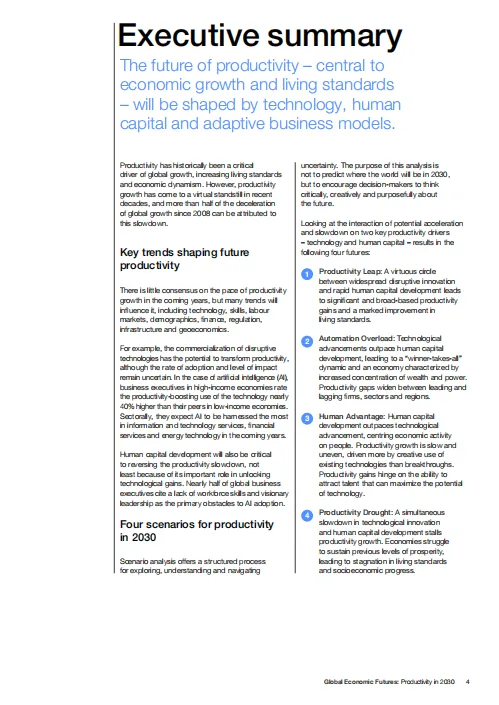 这份由世界经济论坛与埃森哲联合发布的白皮书,聚焦 2030 年全球生产力发展趋势,通过场景分析与行业评估,为决策者提供战略参考。