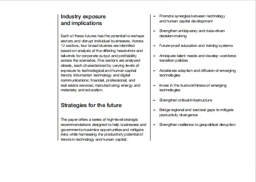 基于技术与人力资本的加速或放缓两种轨迹,报告构建了四种 2030 年生产力发展场景。“生产力跃升” 场景中,技术创新与人力资本发展形成良性循环,推动广泛且显著的生产力提升;“自动化过载” 场景下,技术进步快于人力资本发展,导致财富与权力集中,加剧贫富差距;“人力优势” 场景里,人力资本发展领先技术进步,经济活动以人为核心,生产力增长依赖现有技术的创造性应用;“生产力枯竭” 场景中,技术创新与人力资本发展同时放缓,经济繁荣难以持续,生活水平陷入停滞。