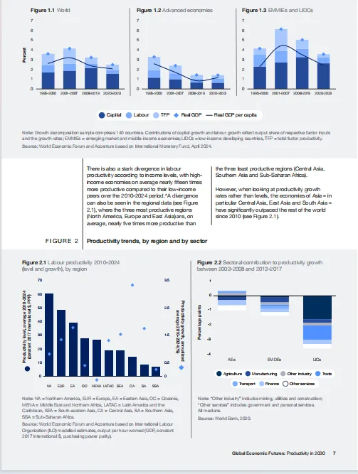 报告指出,生产力是全球经济增长与生活水平提升的核心驱动力,但近几十年来增长陷入停滞,2008 年金融危机后全球经济增长放缓的半数原因可归咎于此。全要素生产率(TFP)在全球范围内从 21 世纪初的年均 1.6% 降至金融危机后的 0.6%,高收入与低收入经济体间的劳动生产率差距高达 15 倍,企业间的生产力鸿沟也持续扩大。