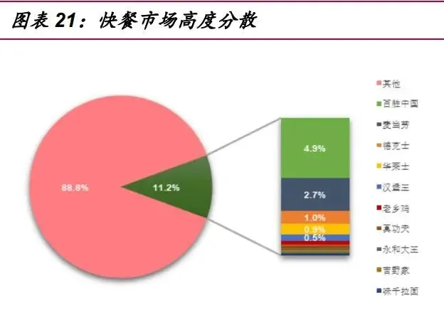 中国快餐整体市场高度分散,西式快餐 龙头稳定。2020 年,中国在营快餐门店约 269.8 万家,新开门店约 82.8 万家,关闭 门店约 123.9 万家,其中,西式快餐强者恒强,炸鸡品类净增 2 万家门店,前十强 增 1.3 万家。按收入口径,2019 年,中国快餐市场 CR10 为 11.20%,肯德基以 4.9%的份额独占鳌头。(报告来源:未来智库)