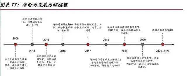 发展历程:十载求索回归直营,一朝崛起快速扩张。2009 年,创始人徐炳忠先 生在五道口成立第一家海伦司酒馆,依赖加盟方式,酒馆在 2018 年扩张至 101 家。之后,基于团队对行业发展的理解和对整体战略的考量,海伦司制定了直营拓展战略。目前,公司直营门店数由 2018 年的 84 家增至 2021 年 9 月 24 日的 584 家,连续三 年在中国酒馆业保持最大规模。