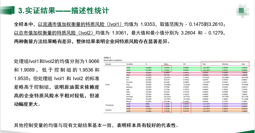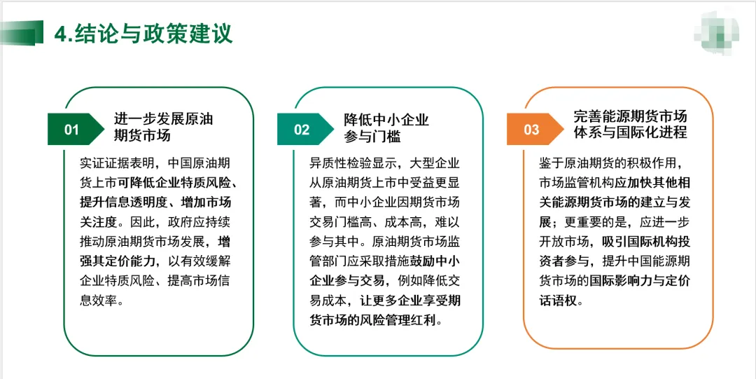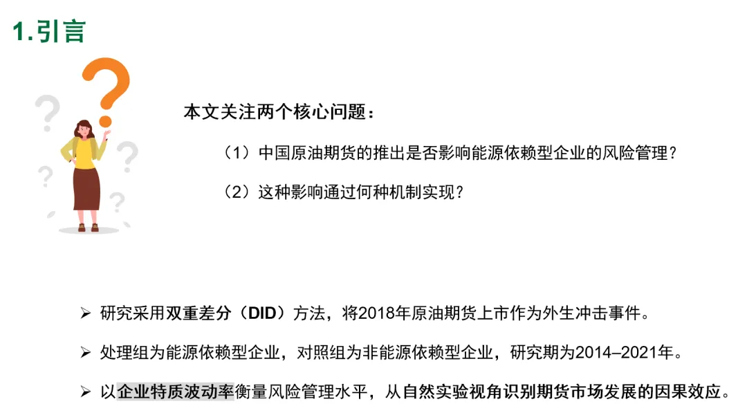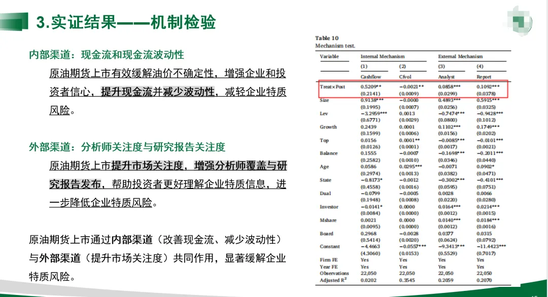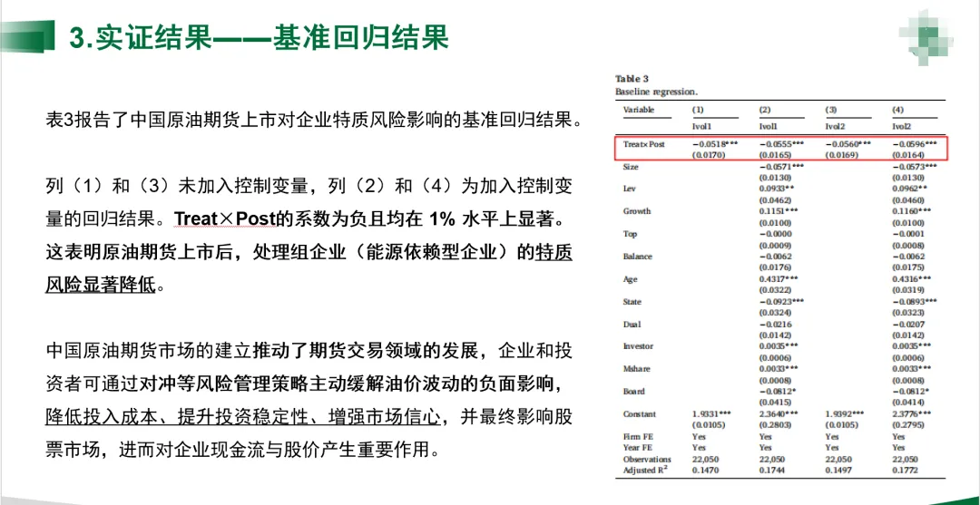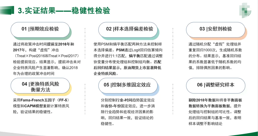 【文章做了什么?如何做的?结果如何?】 文献表明,中国在上海国际能源交易所(INE)推出 COF 合同后,大多数中国公司都持有包含SC的投资组合。结果表明,原油期货波动率与上市公司股票表现之间的关系具有明显的行业特征。因此,我们采用公司特质波动率(反映公司特定的私人信息或噪音交易)来衡量公司的风险管理,以研究中国的 COF 对其的影响。我们采用双重差分 (DID) 方法研究了 2014 年至 2021 年期间持有 SC 合同对公司风险管理的影响,其中我们认为 2018 年中国 COF 的正式上市是一种外生事件冲击。实证结果表明,中国 COF 的推出显著降低了依赖能源的中国公司持有上海原油期货 (SC) 时的特殊风险。我们的结果表明,使用原油期货进行对冲可以有效降低与原油现货交易相关的交易风险,使 SC 持有有利于企业风险管理。基准回归结果的稳健性通过一系列测试得到证实,包括平行趋势检验、预期效应检验、倾向得分匹配、熵平衡匹配、安慰剂检验、替代特质风险计算、控制多维固定效应和研究样本的调整。机制测试进一步表明,持有 SC 的能源依赖型公司通过内部和外部渠道减轻特殊风险。中国投资者通过在内部现金渠道内进行对冲来稳定内部融资并降低价格风险。在外部信息渠道方面,中国 COF 的推出增加了投资者对能源依赖型企业的关注。此外,COF 产生的利好消息减少了投资者的看法异质性,使信息来源多样化,并减少了个股交易的噪音。