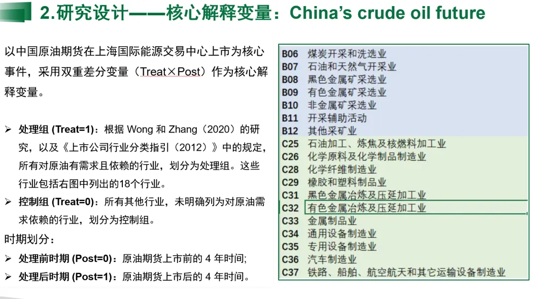 核心解释变量X:We consider China’s crude oil futures launch at the Shanghai International Energy Exchange as the pivotal event and utilize differences-indifferences, denoted as Treat×Post, as the core explanatory variable