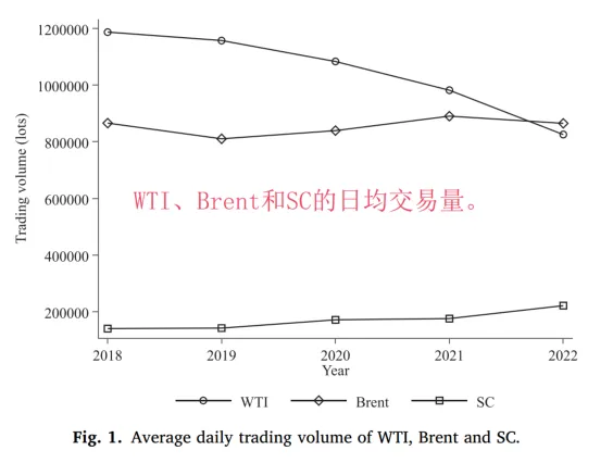 中国是世界上最大的原油进口国之一,自2013年超过美国以来,原油依赖度已达到55.2%。根据国家统计局的数据,到2021年,这一比例已上升至72%。中国原油期货需求的增长和在原油定价体系中相对薄弱的影响力都推动了中国原油期货合约的建立。 经过中国政府数年的准备、规划和讨论,以人民币计价的原油期货合约上海原油期货(Shanghai crude oil futures, SC)于2018年3月26日在上海国际能源交易所(INE) 正式开始交易。此后,SC的交易量持续增长,在短时间内超过 阿曼原油期货合约(Oman crude oil futures) ,成为全球第三大原油期货交易合约。图1显示了2018-2022年WTI、Brent和SC的日均交易量。布伦特原油的交易量每年都保持相对稳定。