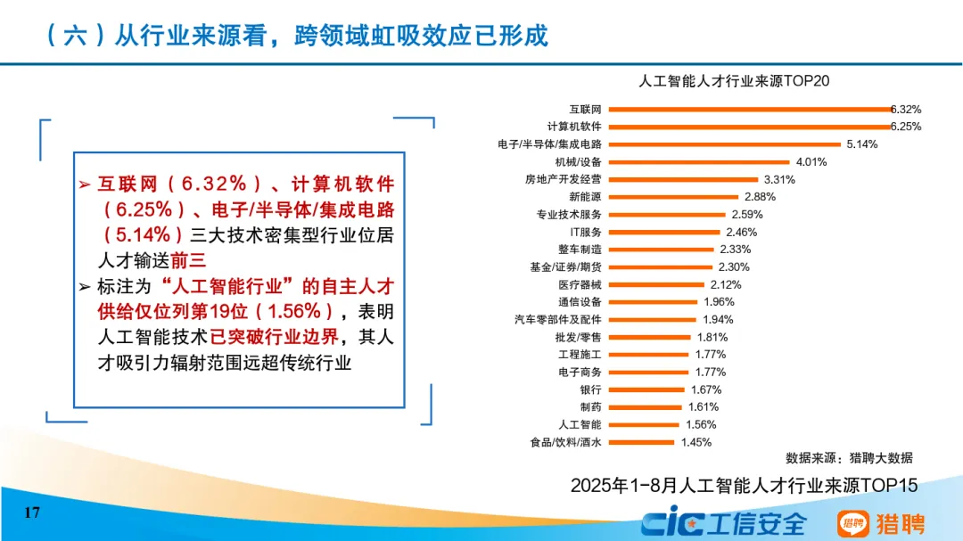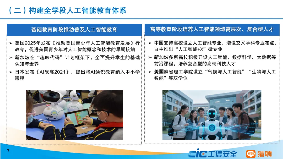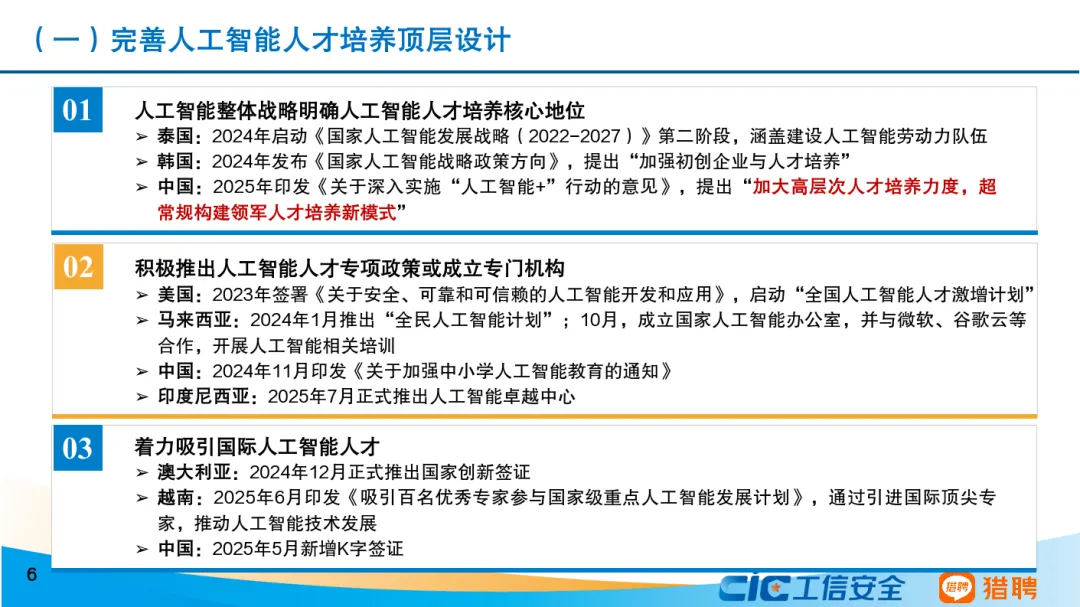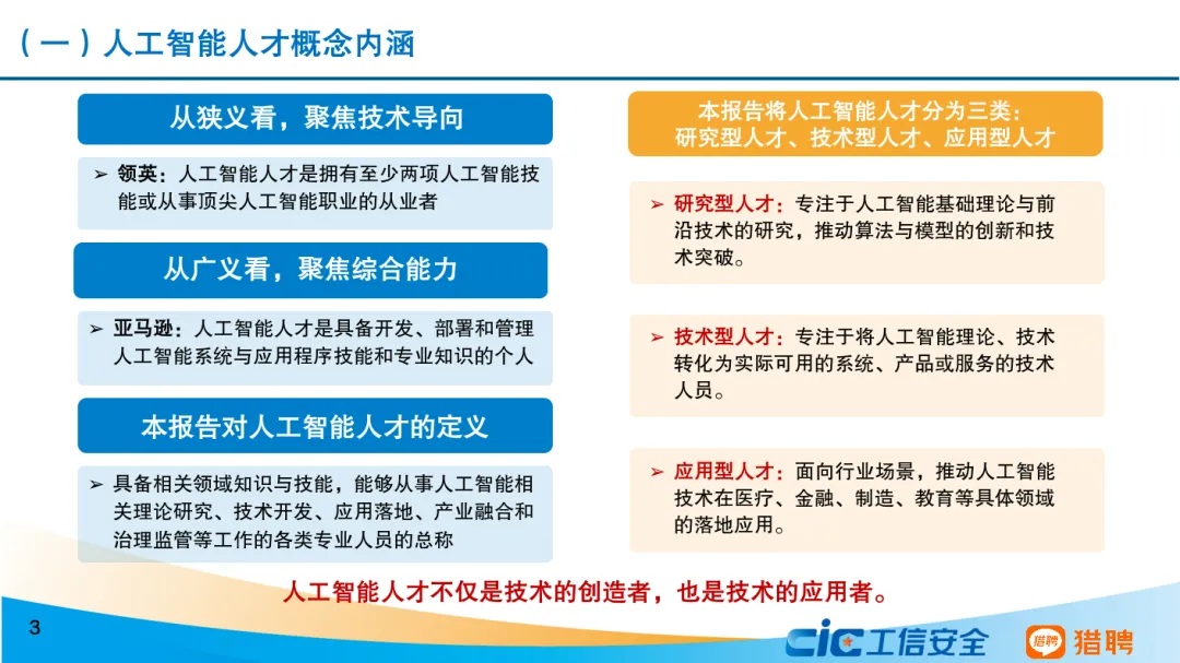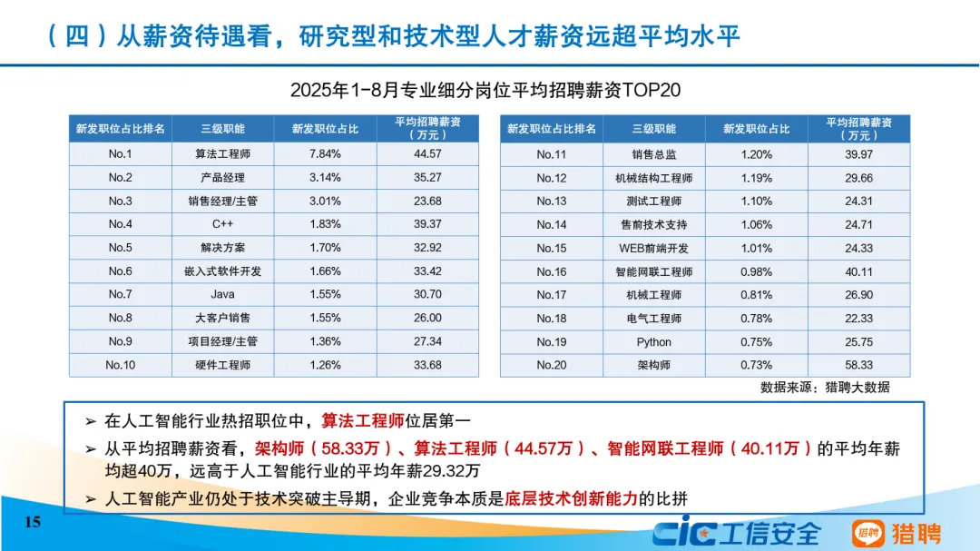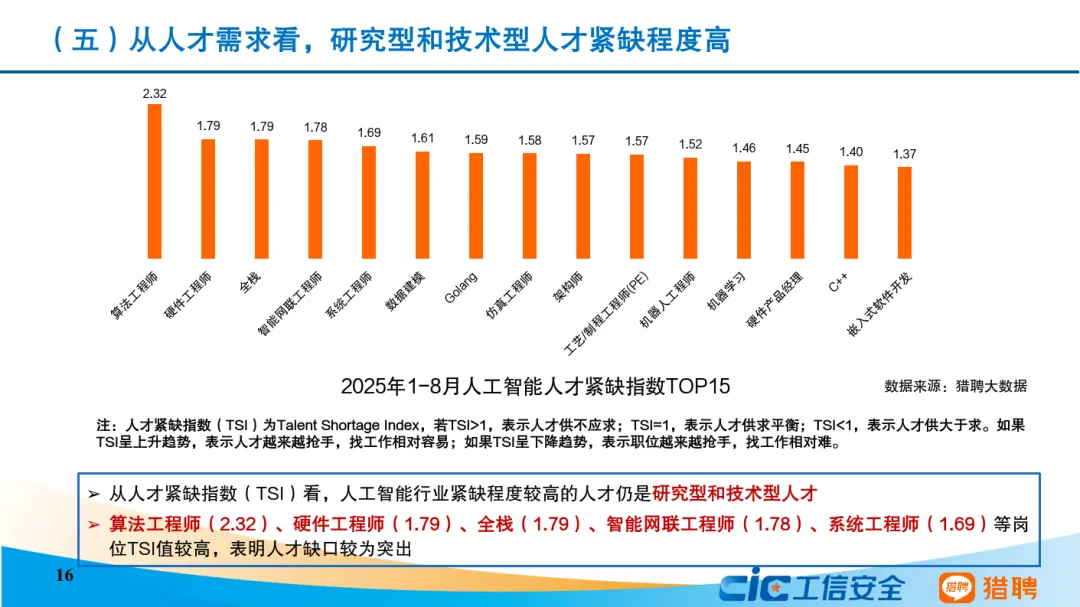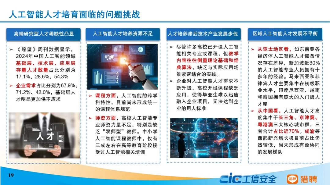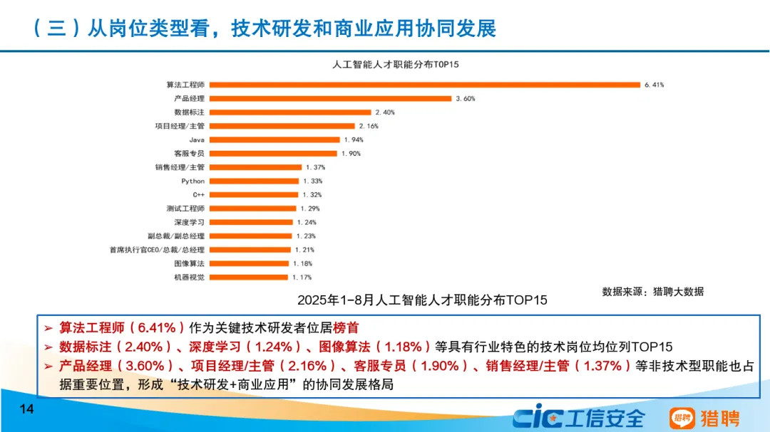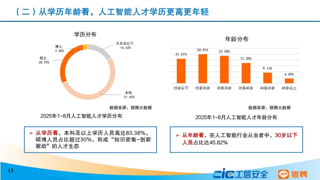 从发展态势来看,当前我国人工智能人才发展呈现六个主要特点。一是我国积极推进全学段、全社会人工智能教育,以及劳动者人工智能能力建设。二是人工智能人才呈现学历更高、更年轻的特征,30岁以下人员占比达45.82%,本科及以上学历人员高达83.38%。三是技术研发和商业应用协同发展。算法工程师岗需求占比最高,非技术型岗位需求同样占据重要位置。四是研究型和技术型人才薪资远超平均水平,架构师等底层技术职业的平均年薪超过人工智能行业平均水平。五是研究型和技术型人才高度紧缺。六是人工智能技术已突破行业边界,其人才吸引力辐射范围远超传统行业。