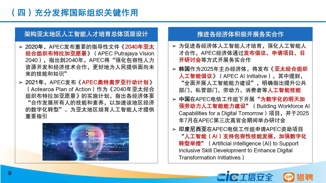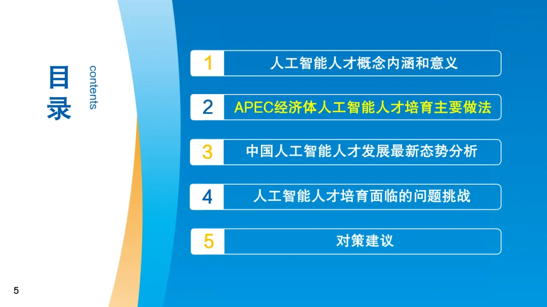 从经验做法来看,APEC经济体近年来主要通过四种主要方式积极培育人工智能人才。一是完善人工智能人才培养顶层设计,明确人才核心地位,积极推出专项政策或成立专门机构。二是贯穿基础教育和高等教育,构建全学段人工智能教育体系。三是开展多层次人工智能技能培训,推动社会多元主体协同开展培训,并加强评价认证。四是充分发挥国际组织关键作用,架构亚太地区人工智能人才培育总体顶层设计,推进各经济体积极开展务实合作。