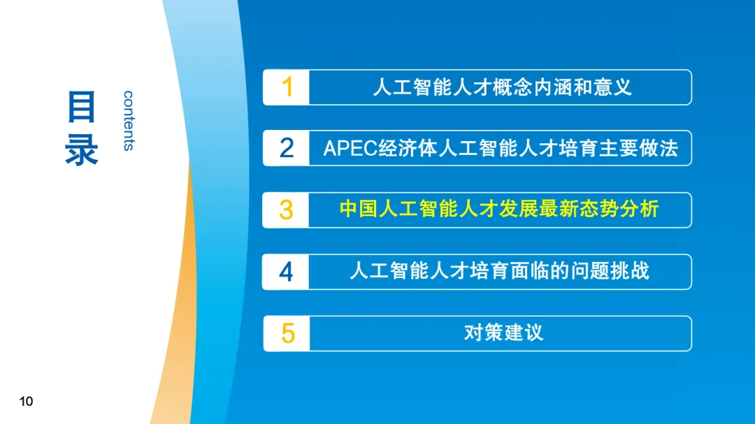 人工智能时代,培育人工智能人才成为打造数字经济新优势的有效途径,是抢抓人工智能发展机遇的必然选择、推动产业优化升级的有力抓手,也是扩大就业创业规模的关键举措。《报告》认为人工智能人才是具备相关领域知识与技能,能够从事人工智能相关理论研究、技术开发、应用落地、产业融合和治理监管等工作的各类专业人员的总称,并将人工智能人才划分为研究型人才、技术型人才、应用型人才三类。《报告》系统梳理了APEC经济体人工智能人才培育的经验做法,重点分析了我国人工智能人才发展态势特点。