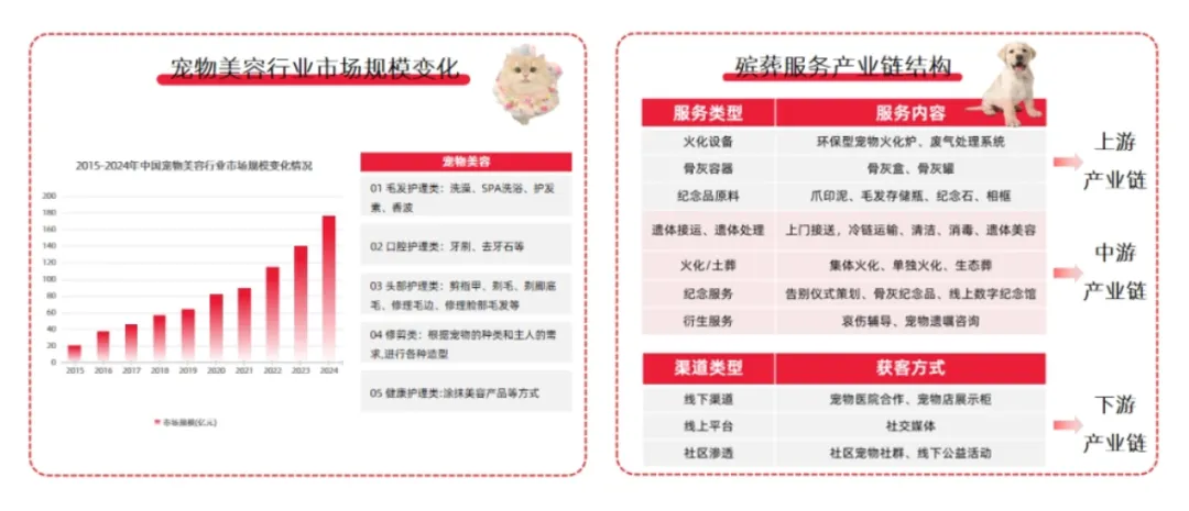 ④服务向情感化升级:宠物摄影、殡葬等赛道快速增长,表明宠物服务已从基础养护升级为情感承载,情感共鸣成为服务类消费的核心驱动力