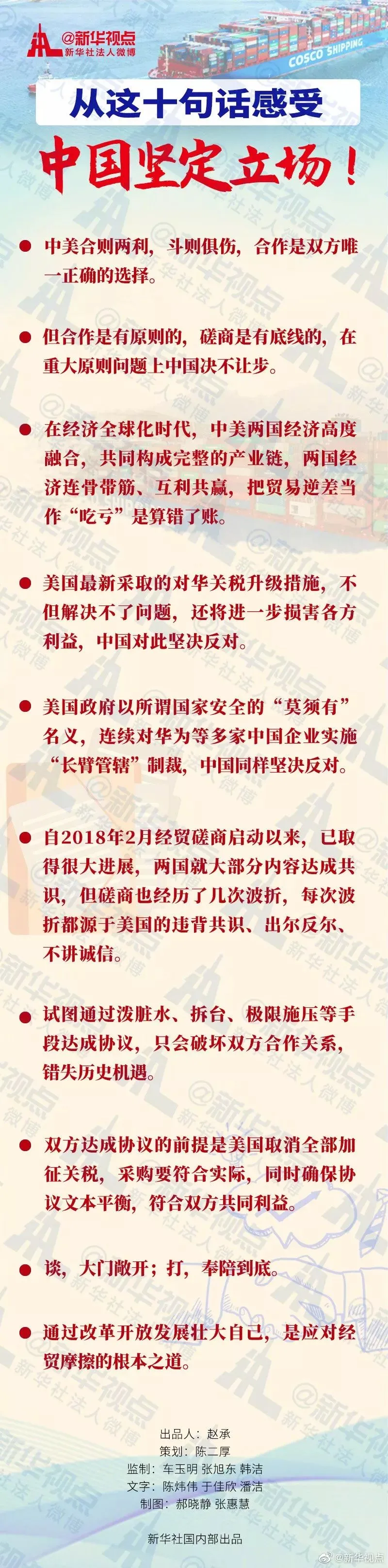 美国近期宣布提高对华加征关税,不利于解决双边经贸问题,中国对此强烈反对,不得不作出反应,维护自身合法权益。中国的立场和态度是一贯的、明确的,中国希望通过对话而不是关税措施解决问题。为了中国人民的利益,为了美国人民的利益,为了全世界人民的利益,中国会理性对待,但是中国不会畏惧任何压力,也做好准备迎接任何挑战。谈,大门敞开;打,奉陪到底。