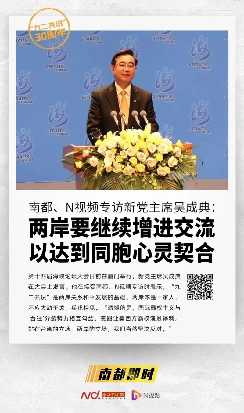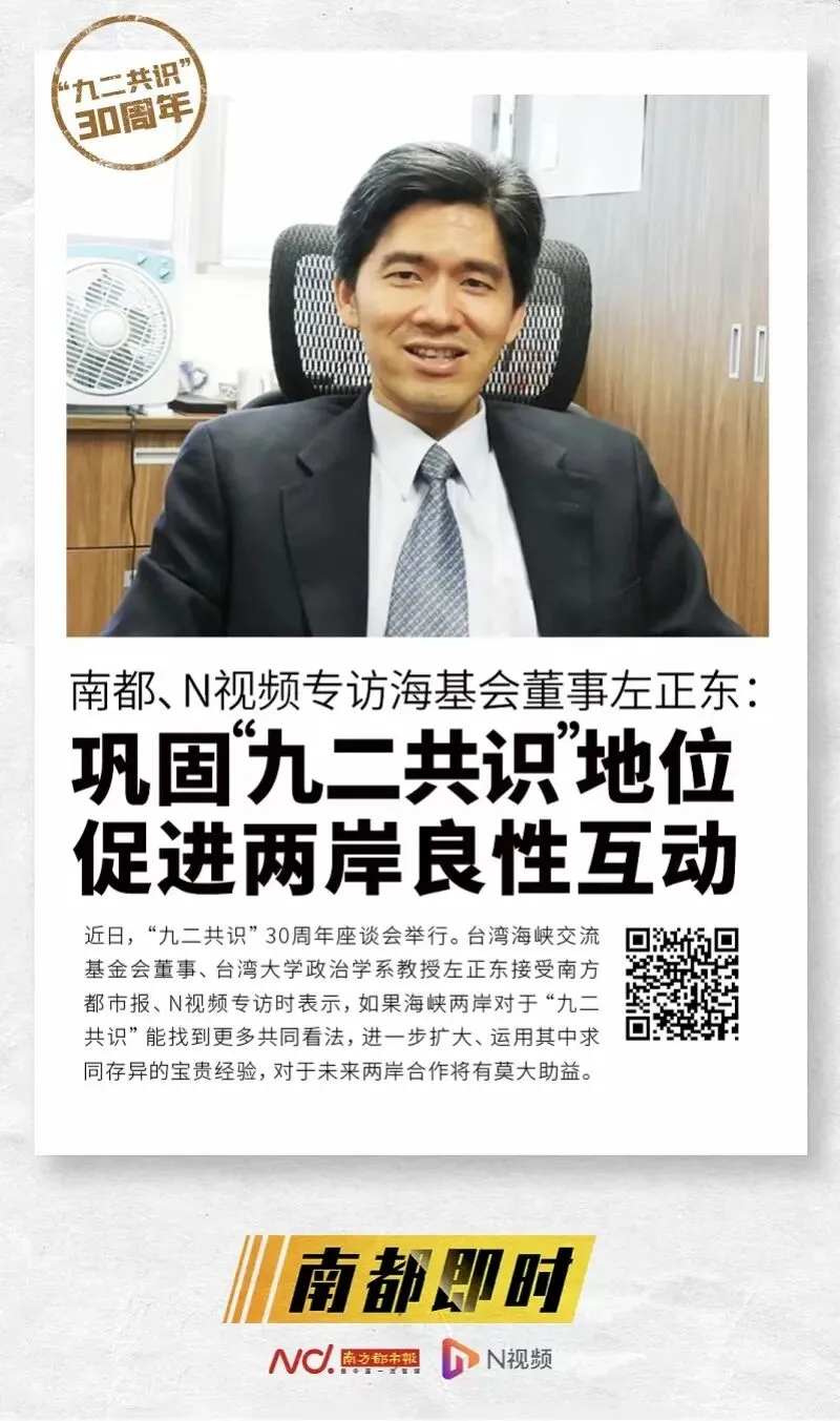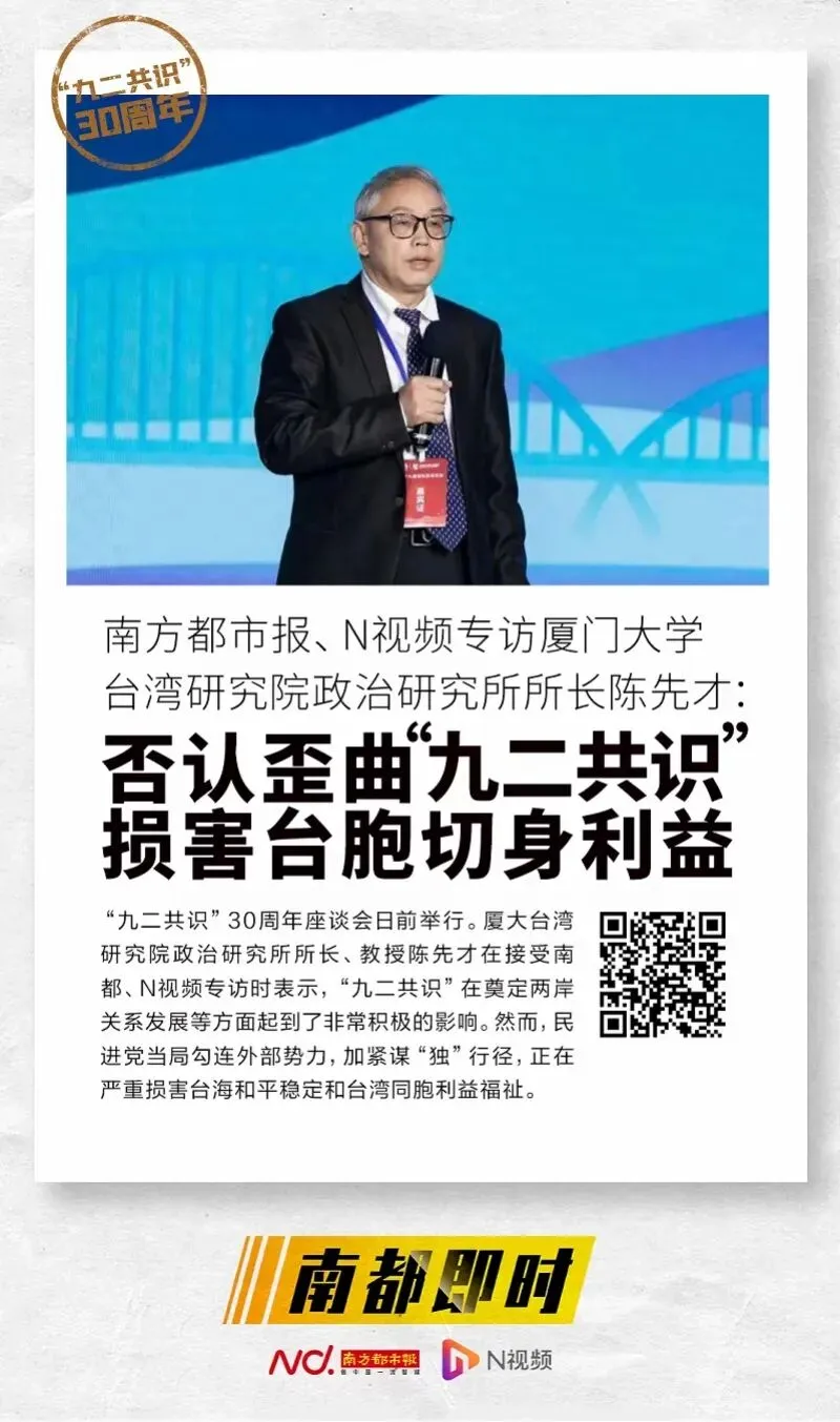 此前,厦门大学台湾研究院政治研究所所长、教授陈先才接受南都专访时表示,“‘九二共识’达成后,为两岸搁置政治分歧、开启两岸两会协商谈判、开创和维护两岸关系和平发展的良好局面发挥了重要作用,已成为稳定两岸关系与台海局势的‘定海神针’”。