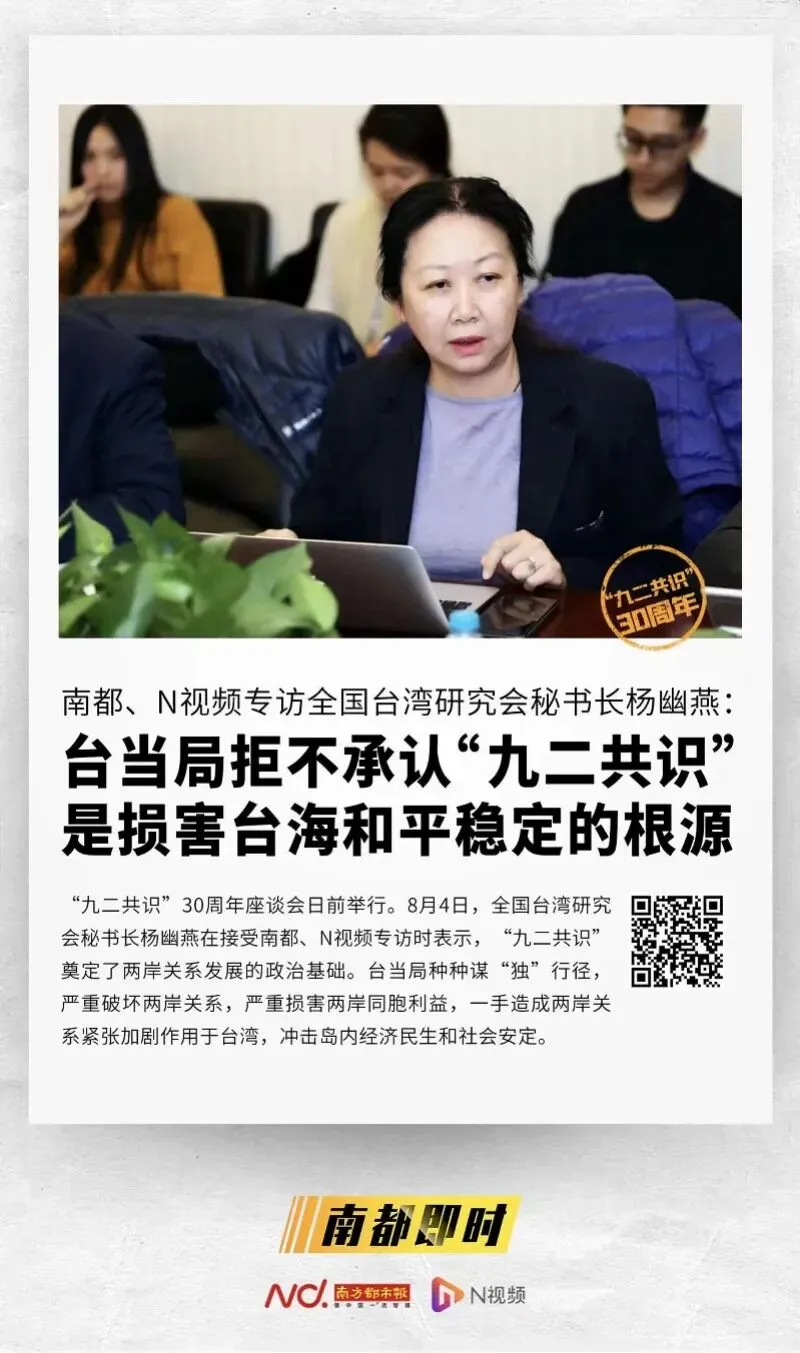 全国台湾研究会秘书长杨幽燕此前接受南都专访时说,“民进党当局顽固坚持‘台独’立场、拒不承认‘九二共识’,是损害台海和平稳定、造成两岸关系停滞僵持的根源。只要民进党当局不改邪归正,大陆方面的反‘台独’斗争就会一直持续下去,两岸关系就会持续紧张动荡,台湾民众也会深受其害”。