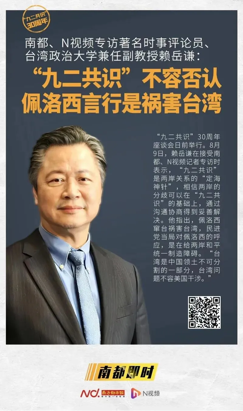 台湾时事评论员、台湾政治大学兼任副教授赖岳谦接受南都记者专访时指出,“美国企图掏空一个中国的内涵,因此这次中方对于佩洛西的一系列操作,采取了坚决回击和强力反制。这些都是针对‘台独’势力,针对外部势力干涉,针对美台勾连,作为一个主权国家所采取的正当行为。台湾是中国领土不可分割的一部分,台湾问题不容美国干涉”。