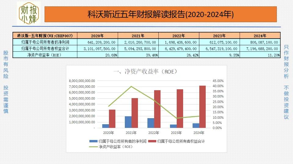 2020年至2024年,科沃斯的归属于母公司所有者的净利润分别为6.41亿元、20.10亿元、16.98亿元、6.12亿元、8.06亿元,归属于母公司所有者权益合计分别为31.01亿元、50.94亿元、64.29亿元、65.47亿元、71.97亿元,净资产收益率分别为20.68%、39.46%、26.42%、9.35%、11.20%,部分高于15%,股东回报率有波动,需关注持续性。