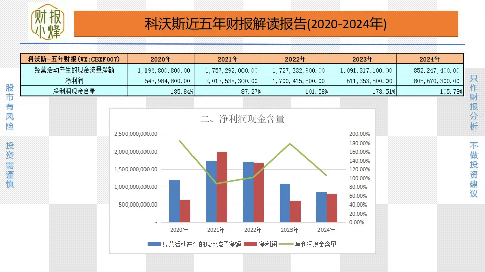 2020年至2024年,科沃斯的净利润分别为6.44亿元、20.14亿元、17.00亿元、6.11亿元、8.06亿元,净利润现金含量分别为185.84%、87.27%、101.58%、178.51%、105.78%,多数大于100%,净利润含金量高,现金创造能力强劲。