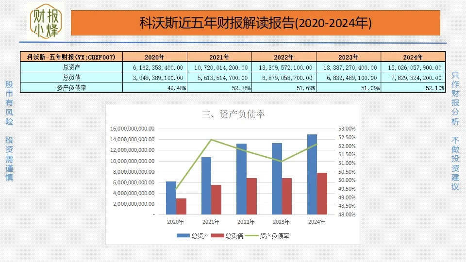 2020年至2024年,科沃斯的总资产分别为61.62亿元、107.20亿元、133.10亿元、133.87亿元、150.26亿元,总负债分别为30.49亿元、56.14亿元、68.79亿元、68.39亿元、78.29亿元,资产负债率分别为49.48%、52.36%、51.69%、51.09%、52.11%,一直低于60%,且整体稳定,偿债风险较低,财务结构稳健,如同磐石般稳固,让人安心。