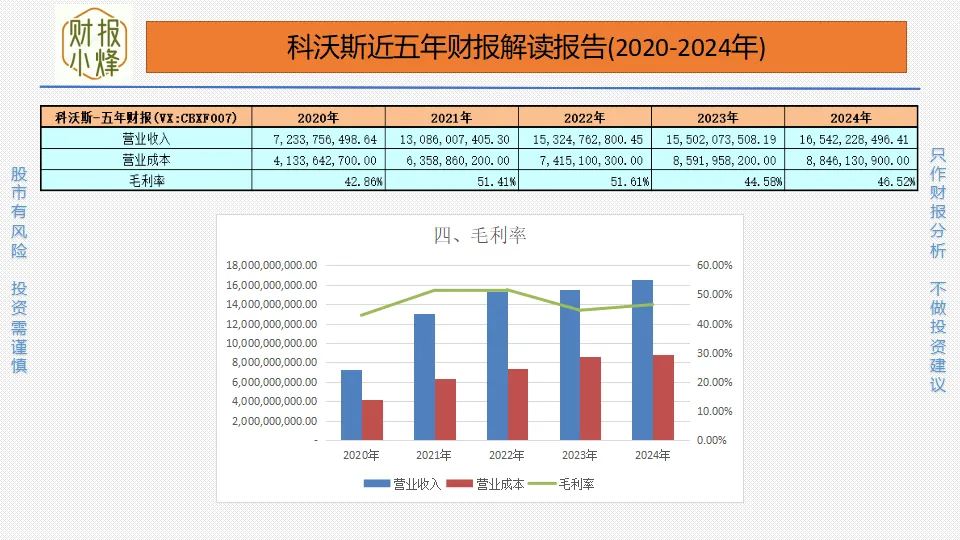 2020年至2024年,科沃斯的营业收入分别为72.34亿元、130.86亿元、153.25亿元、155.02亿元、165.42亿元,营业成本分别为41.34亿元、63.59亿元、74.15亿元、85.92亿元、88.46亿元,毛利率分别为42.86%、51.41%、51.61%、44.58%、46.52%,一直大于40%,产品竞争力较强,盈利能力出众。