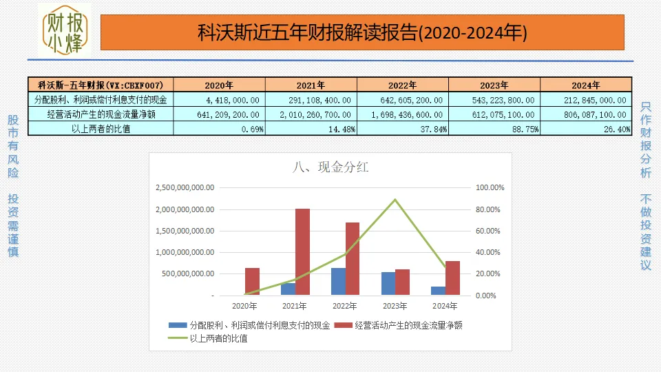 2020年至2024年,科沃斯的现金分红金额分别为0.04亿元、2.91亿元、6.43亿元、5.43亿元、2.13亿元,现金分红率分别为0.69%、14.48%、37.84%、88.75%、26.40%,部分大于20%,分红幅度适中,股东回报率尚可。
