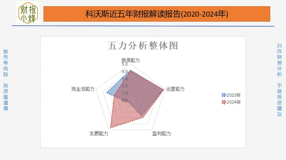 科沃斯的偿债能力与去年同期相比持平,保持在中高水平;运营能力与去年同期相比持平,保持在高水平;盈利能力与去年同期相比略有提升,由中低水平提升至中等水平;发展能力与去年同期相比暴发式增长,由低水平增长至高水平;现金流能力与去年同期相比明显下降,由中等水平下降至中低水平;整体来看“五力”明显提升。