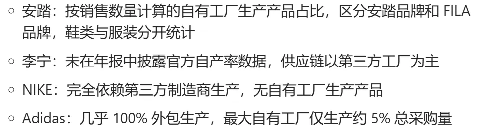 自产率数据反映了品牌供应链策略的调整:通过降低自产占比,优化成本结构、提升供应链灵活性、聚焦核心能力(研发与品牌),以适应市场竞争及全球化布局的需求。这种调整是体育用品行业“轻资产”模式的典型体现,旨在实现“效率与品质”的平衡。