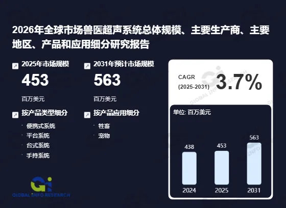 据调研数据显示,按收入计,2025年全球兽医超声系统收入大约达到453百万美元。(数据来源:《2026年全球市场兽医超声系统总体规模、主要生产商、主要地区、产品和应用细分研究报告》 出版商:环洋市场咨询(Global Info Research))环洋市场咨询发布的,通过销量、价格、收入和市场份额等核心指标量化分析,深入剖析了全球兽医超声系统的总体规模、区域市场格局等关键维度,为行业参与者提供了全面的市场洞察与决策参考。