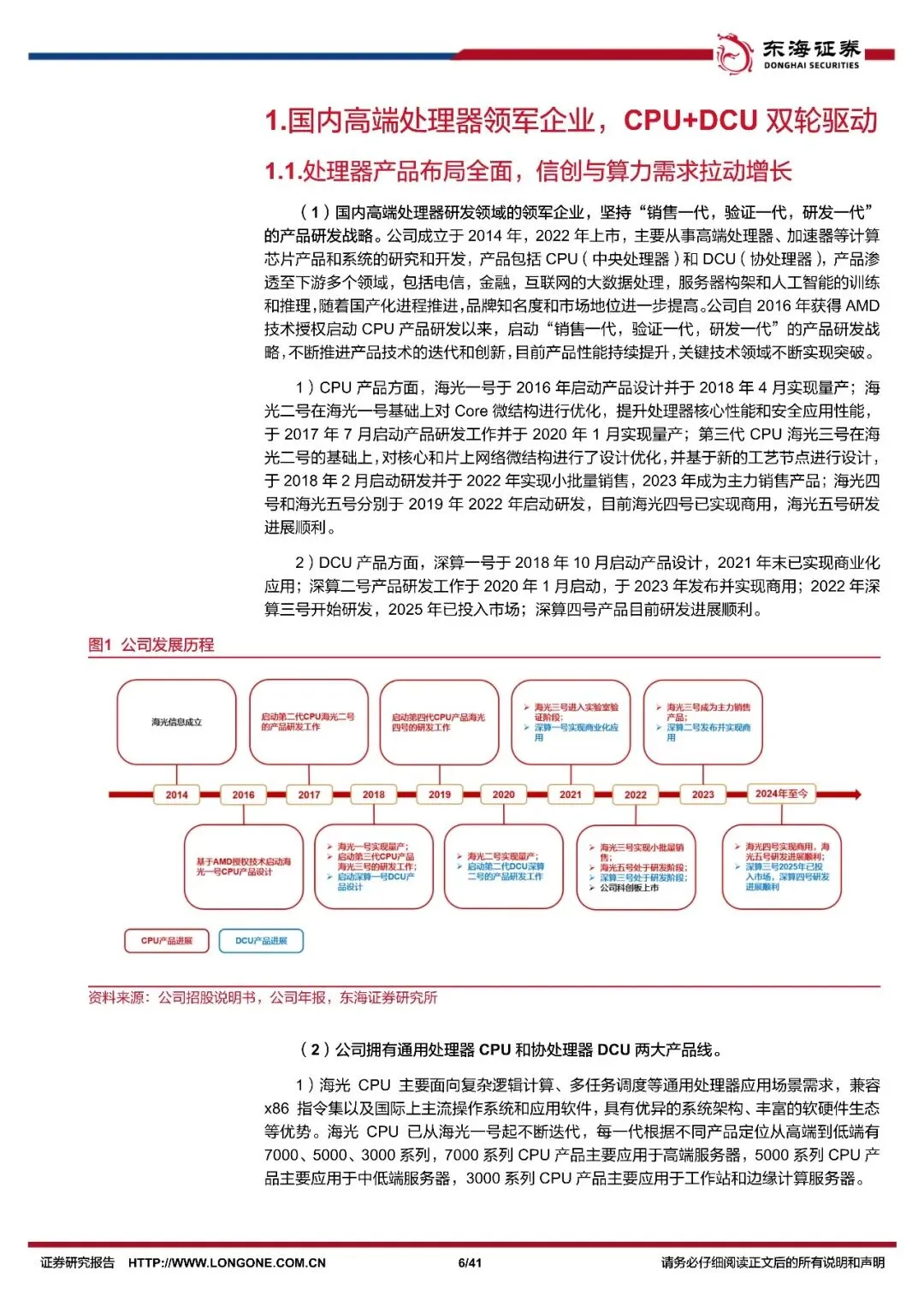 国内高端处理器研发领域的领军企业,坚持"销售一代,验证一代,研发一代的产品研发战略。公司成立于2014年,2022年上市,主要从事高高端处理器、加速器等计算芯片产品和系统的研究和开发,产品包括CPU(中央处理器)和DCU协处理器),产品渗透至下游多个领域,包括电信,金融,互联网的大数据处理,服务务器构架和人工智能的训练和推理,随着国产化进程推进,品牌知名度和市场地位进一步步提高。公司自2016年AMD技术授权启动CPU产品研发以来,启动"销售一代,验证一代,验证一代,研发一代"的产品研发战略,不断推进产品技术的迭代和创新,目前产品性能持续提升,关键技术领域不断实现突破。