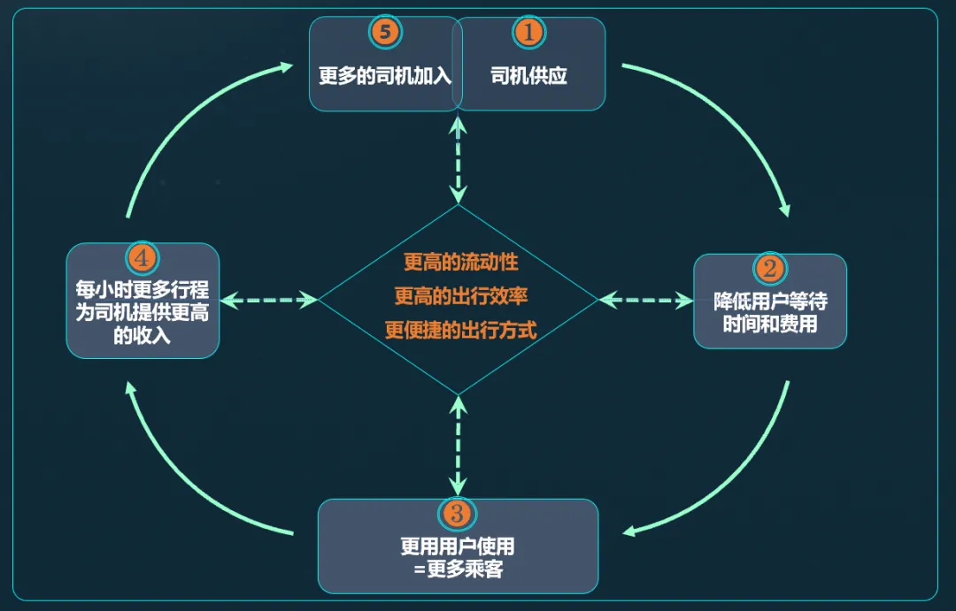 第3步,用户因为叫车成功率更高、等待时长更短而更愿意使用该产品,从而更倾向于使用优步出行,这就会吸引更多用户使用。