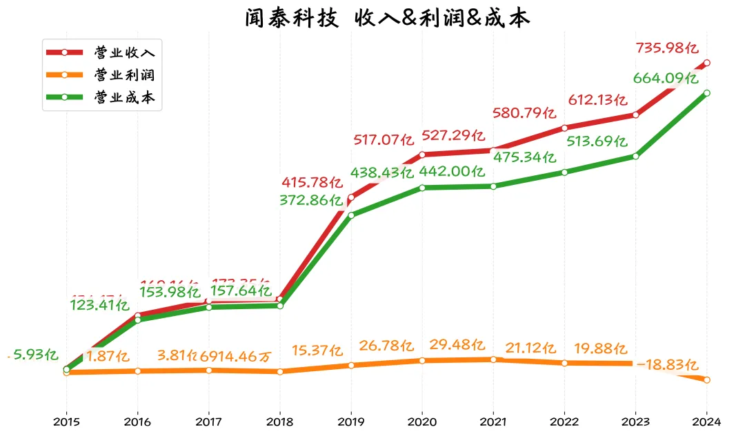 闻泰科技2024年收入736亿,是2015年的100倍多,然而2024年营业利润却是负的18.8亿。