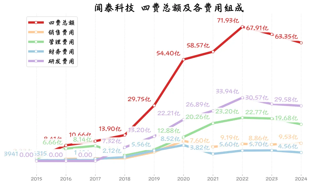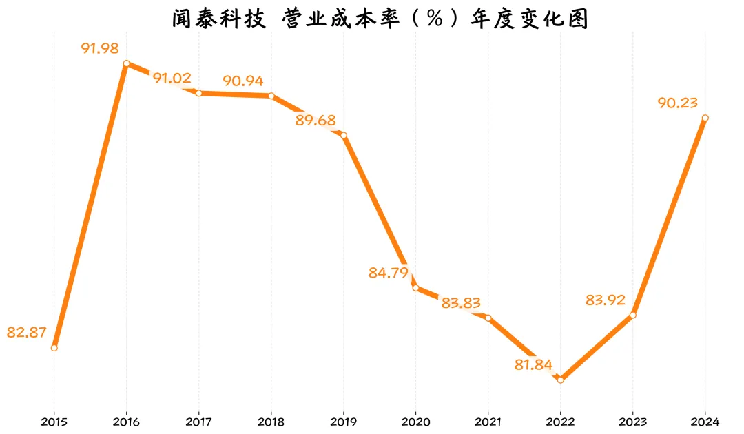 公司的成本一直都比较高,2024年成本率90.23%,也就是每100元收入里,有90.23元都要花在成本上,导致利润很薄。