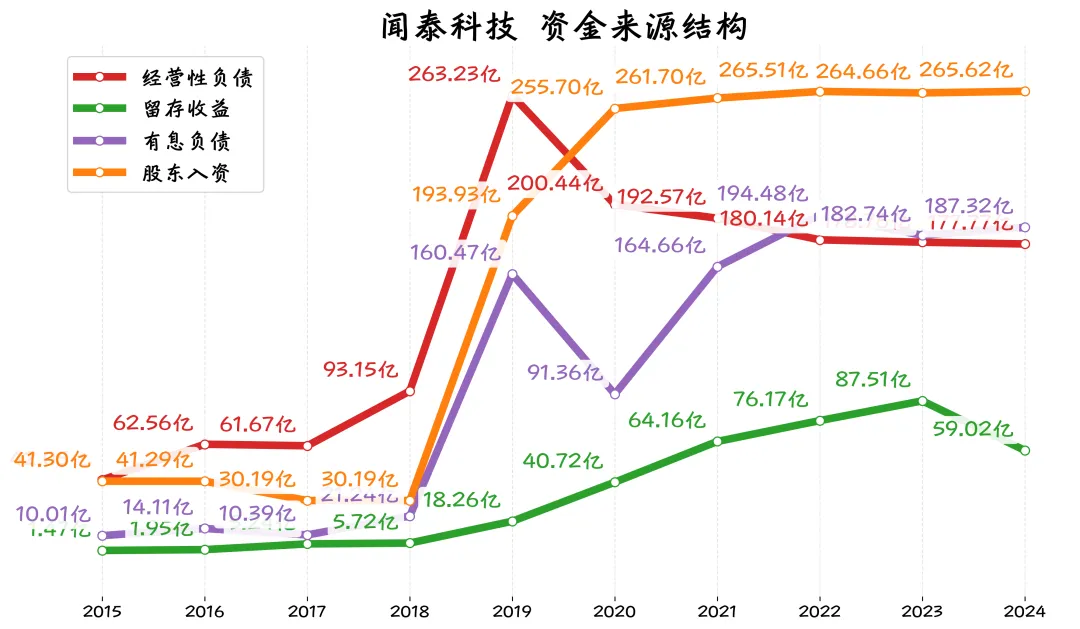 闻泰科技的运营,主要靠股东的钱(266亿),然后是借的钱(187亿),而留存收益59亿元,占比不到9%。