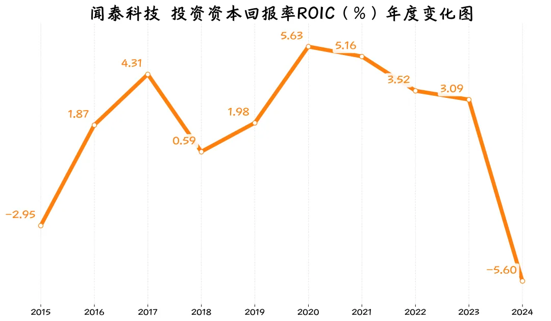 ROIC在2020年是十年最高(5.63%)。但2024年为-5.6%。