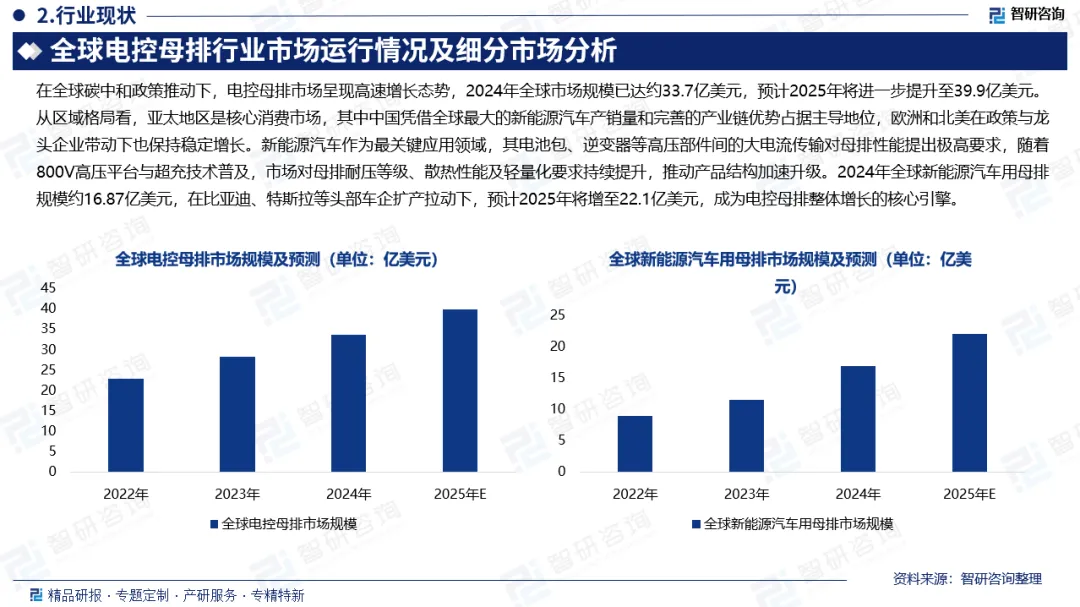 全球电控母排市场规模:近年来,在全球碳中和政策推动下,电控母排市场呈现高速增长态势,市场规模与产能同步快速扩张。2024年全球电控母排市场规模已达约33.7亿美元,在新能源汽车、电力能源、数据中心等多领域需求共同拉动下,预计2025年将进一步提升至39.9亿美元。从区域格局来看,亚太地区是核心消费市场,其中中国凭借全球最大的新能源汽车产销量和完善的产业链优势占据主导地位;欧洲在严格碳排放法规驱动、北美以特斯拉为代表的企业加速电动化布局的带动下,也保持了稳定的需求增长。