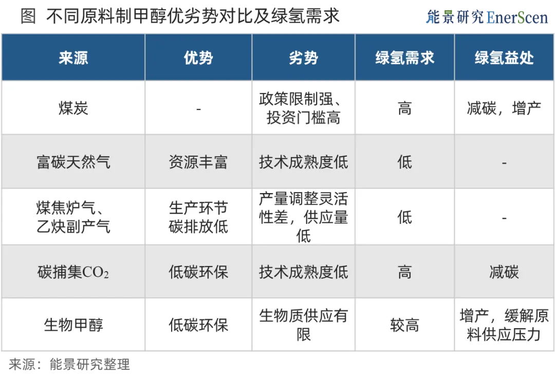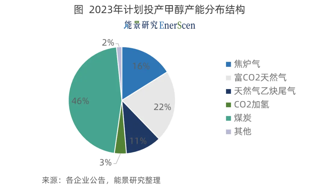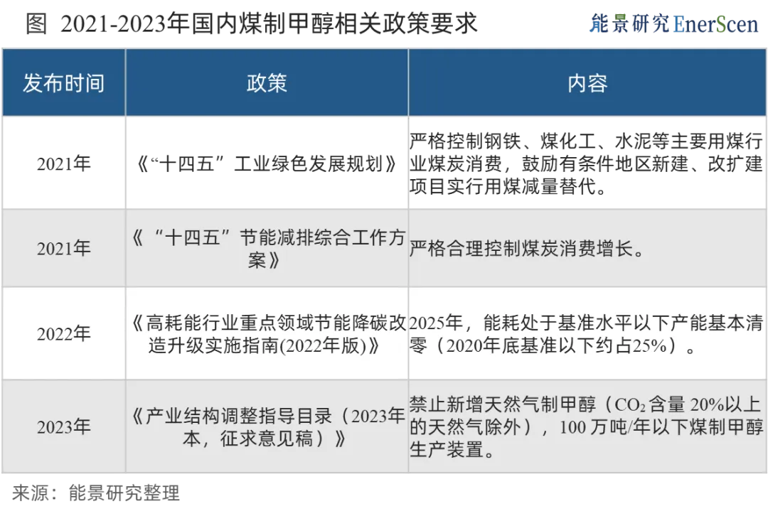 近年来,在传统需求复苏以及新兴需求快速起量的双重驱动下,国内甲醇产能快速扩张,并于2023年进入亿吨级产能时代。与此同时,从2020年左右开始我国能耗“双控”政策日渐严格,甲醇产能的继续扩张受到越来越严格的限制,亟需寻找新的发展路径。以绿氢耦合甲醇行业发展,可降低甲醇生产过程中的能耗、煤耗及碳排放,推动甲醇生产绿色转型,符合新建产能政策要求;而且使用绿氢也可迎合下游新兴市场需求,带来新的市场增长机遇。但机遇不是简单的、广泛的,是区域性的、分布式的、阶段性的,需要深度挖掘和研判。此篇文章特节选能景研究最近报告《绿氢及绿氨发展机遇研究》成果,供行业参考。01 “双控”政策严卡甲醇新建产能,绿氢耦合是重要突破途径我国甲醇的生产结构以煤制甲醇为主。根据隆众资讯数据,截至2022年底,我国甲醇产能达到约1亿吨/年,其中我国煤制甲醇占到了80%左右,天然气制甲醇、煤焦炉气各约占10%。而近年来在“双控”(能耗总量及强度)方针下,甲醇新建产能尤其煤制甲醇受到了中央及地方上的严格限制:一是设置了煤制甲醇新建装置规格下限。中央发改委从《产业结构调整指导目录(2019年本)》开始,明文限制新建100万吨/年以下煤制甲醇生产装置,抬高了煤制甲醇新建投资成本。二是严卡煤耗、能耗指标。部分省份明文规定,新建煤制甲醇产能必须对本省煤制甲醇已有煤耗等进行等量或减量替代(总量只减不增)。即若无有效减少煤碳(能耗)消耗的技术手段,将无法新增产能。三是碳排放指标监管或将收紧。2023年7月中央深改委通过《关于推动能耗双控逐步转向碳排放双控的意见》文件,由以煤耗为指标的“能耗双控”转向碳排为指标“碳排双控”,对甲醇生产的碳资源利用水准提出了更高要求。因为新建产能的不断要求,国内甲醇新建产能开始呈现原料差异化、多元化的趋势。除煤炭、天然气、焦炉气外,生物质、电炉尾气、CO2、富CO2天然气、天然气乙炔副产气等也可用于生产甲醇。以焦炉煤气制甲醇为例,2022年焦炉气制甲醇呈现增长态势,新建成产能中煤制与焦炉气制甲醇各占54%与46%,其中焦炉气制甲醇占比相较2021年提高了35%。到2023年,更多多元化产能陆续建成落地,预计新建成产能中电炉尾气、CO2、富CO2天然气、天然气乙炔副产气等4种原料来源的产能合计占比约38%,煤制甲醇占约46%、焦炉气占比约16%。