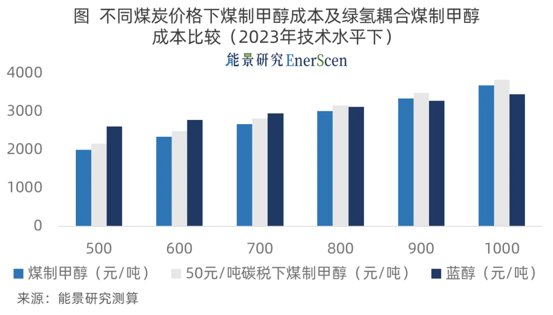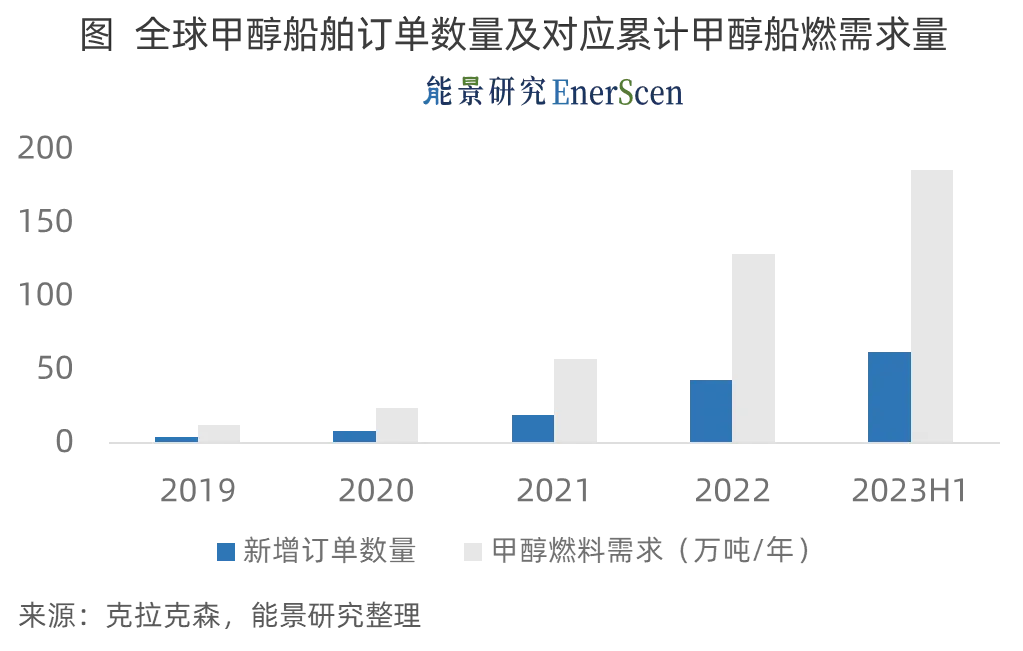 甲醇的下游需求以高分子原料(烯烃、醋酸)、甲醇燃料等为重要支撑。根据中国氮肥工业协会数据,2022年中国甲醇表观消费量达到9224万吨。其中烯烃消费达到约53%,其他如甲醇燃料、醋酸等消费占比约5%左右。高分子原料领域,以甲醇(煤)制烯烃(CTO/MTO)为例,现阶段绿氢需求以头部企业的产能升级主要推动力。截至2022年底国内已建成CTO/MTO产能1772万吨/年,占烯烃总产能的20%左右。其中中石化、中煤等国企的CTO/MTO产能占比达到50%左右;民营企业中以宝丰集团规模最大,产能占比超过10%。2020年开始,宝丰、中石化、中煤等龙头企业陆续开展蓝醇(本文参考国际名称,特指不完全零碳的甲醇,即绿氢耦合煤制甲醇)制烯烃的示范,合计涉及烯烃产能超50万吨/年,预计2025年左右可全部投运。在碳交易、绿电及绿氢生产成本下降等因素支撑下,烯烃生产采用蓝醇的经济性将逐渐凸显:一方面,现阶段国内煤价频繁向高位波动,蓝醇具有一定的成本优势空间:据能景研究测算,煤价越高蓝醇与煤制甲醇成本差距越小,0.2元/kWh绿电价格、700元/吨煤价(2022年国内煤炭长协基准价)时,成本差距可压至300元/吨以内。而2022年国内部分地区某些时段煤价可达2000元/吨,此时使用蓝醇成本优势凸显。另一方面,随着化工领域碳交易市场开启、制氢电解槽技术进步等,煤制甲醇成本升高,而蓝醇成本将不断降低,据能景研究测算,在2025-2030年,蓝醇成本或可与700元/吨煤价时煤制甲醇平价。甲醇燃料领域,以船舶领域甲醇燃料为例,现阶段绿氢需求主要在于零碳生物甲醇的产能扩张。2018年以来,随着国际航运组织、欧盟等陆续出台航运业减碳政策,国际航运船东开始推行使用零碳燃料船舶。其中在当前技术条件下,仅生物甲醇可满足技术成熟、全生命周期零碳排放等应用及政策条件,但当前全球生物甲醇产量不足10万吨/年,亟需扩大产能及产量。相应地,根据前文技术分析,生物甲醇的提产提量需绿氢辅助。按照国际航运组织要求,到2030年左右国际航运业零碳燃料应用须达到5% - 10%,到2050年左右实现净零排放。能景研究根据国内船燃消耗及用能等量换算,到2030年全国生物甲醇需求或将达到245 - 490万吨/年,对应绿氢需求或可达到16 - 32万吨/年;到2050年左右则绿氢需求或可达到320万吨/年(此处未核算绿氨占比)。本篇内容部分参考自以下《绿氨与绿醇的发展机遇研究报告》。报告中围绕甲醇产需两端的政策、地域、企业、市场、成本等进行了更加细致的分析,若有更多了解甲醇行业中绿氢利用机遇的意向,请加下方小景微信,咨询报告原文。