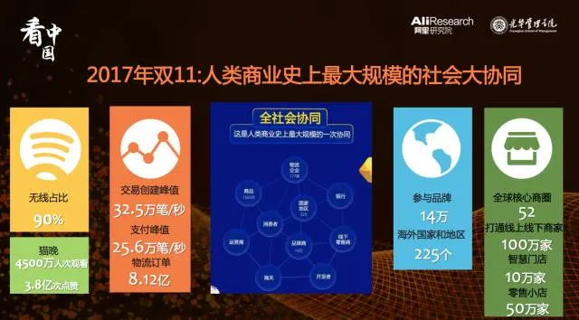 2017年是新零售元年,今年的双11不仅体现了消费升级的大趋势,同时也体现了全社会的大协同,是全社会商业的共振,这个共振来自于线上和线下,来自于海内和海外,是商业、科技、数据、智能的大协同,是人类商业史上规模最大的社会大协同。