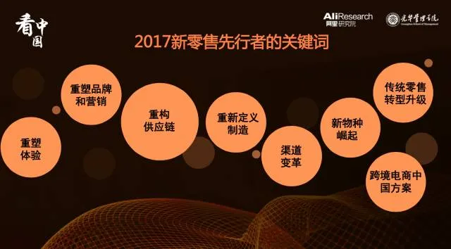 新零售从具体实践来看,意味着基于细粒度的活数据对人货场实现重构,2017年,通过对20个先行者企业实践的观察和研究,尝试归纳出阶段性的8个关键词,它们分别是:重塑体验、重塑品牌和营销,重构供应链,重新定义制造,渠道变革,新物种崛起,传统零售转型升级,跨境电商中国方案。