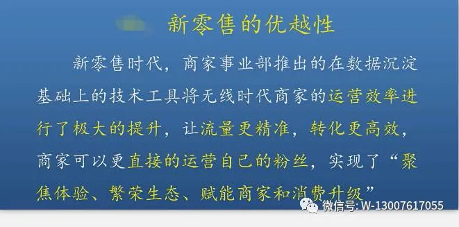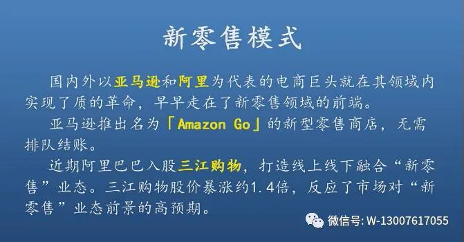本世纪的初期,当传统零售企业还未能觉察到电子商务对整个商业生态圈所可能产生的颠覆性作用之时,以淘宝、京东等为代表的电子商务平台却开始破土而出,电子商务发展到今天,已经占据中国零售市场主导地位,随着“新零售”模式的逐步落地,线上和线下将从原来的相对独立、相互冲突逐渐转化为互为促进、彼此融合,电子商务的表现形式和商业路径必定会发生根本性的转变。当所有实体零售都具有明显的“电商”基因特征之时,传统意义上的“电商”将不复存在,而人们现在传统实体店将不复存在!及早把握趋势,选好平台,掌控未来财富通道,请关注本公众号或微信130 0761 7055