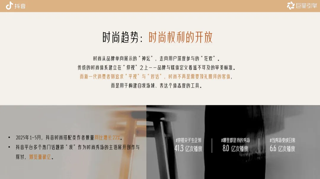 时尚权力开放:从品牌“仰视”到用户“平视”,抖音搭配类作者同比 +22%。