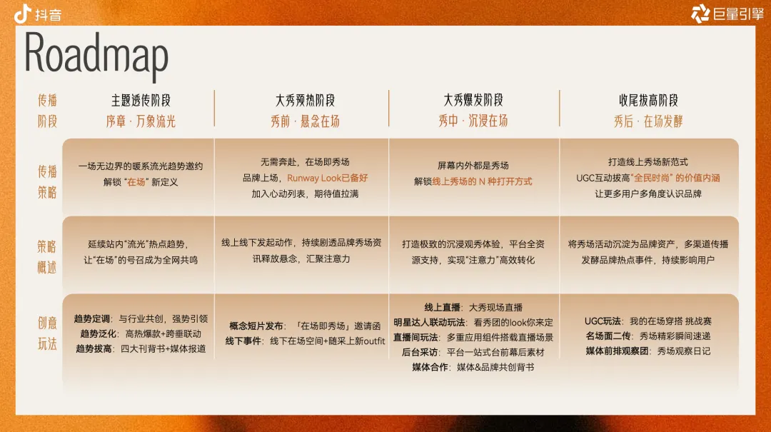 秀中・沉浸在场(爆发转化)‑ 多机位直播(T台/后台/观众)+feedslive 流量补贴+直播加粉/购物组件‑ “在场看秀团”:明星+头部时尚达人现场产出二创内容+即刻进播带货‑ 媒体前排观察团:VOGUE、ELLE 等即时口播+短评+短视频分发